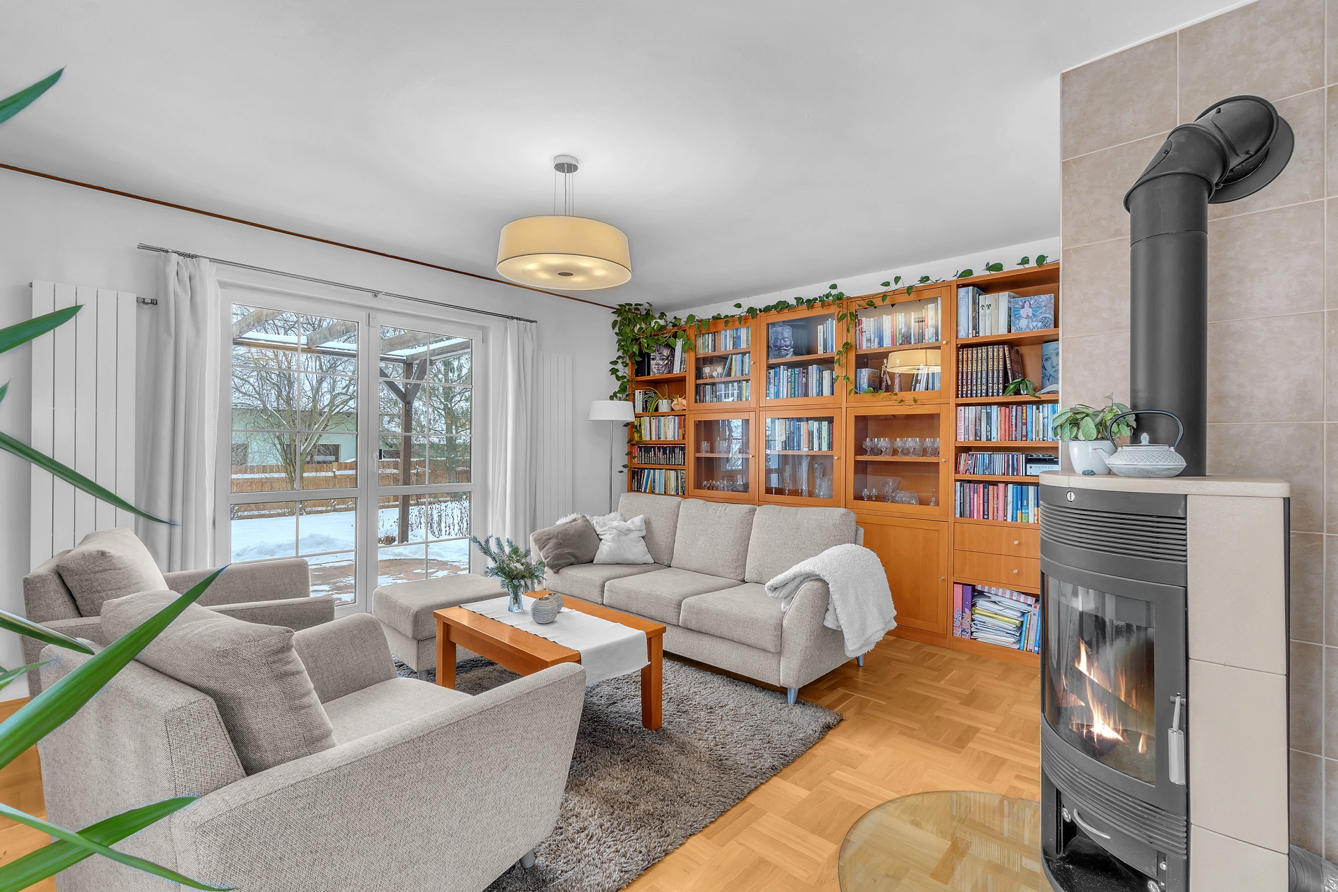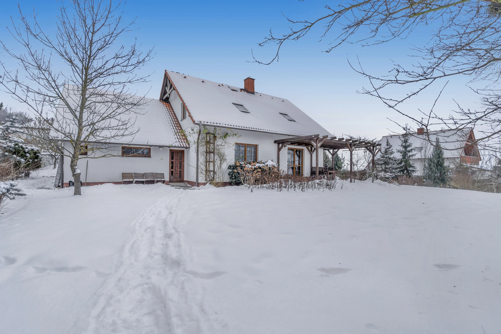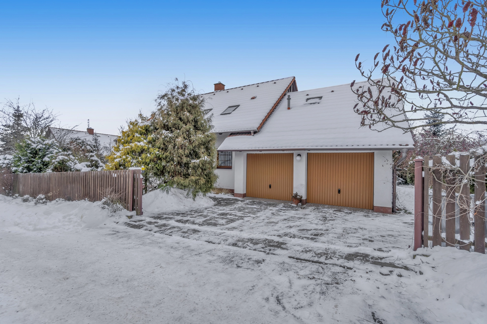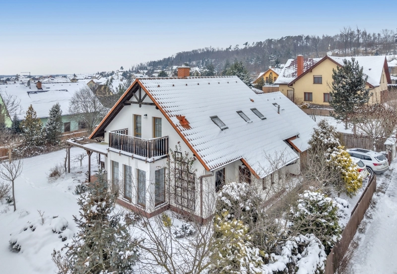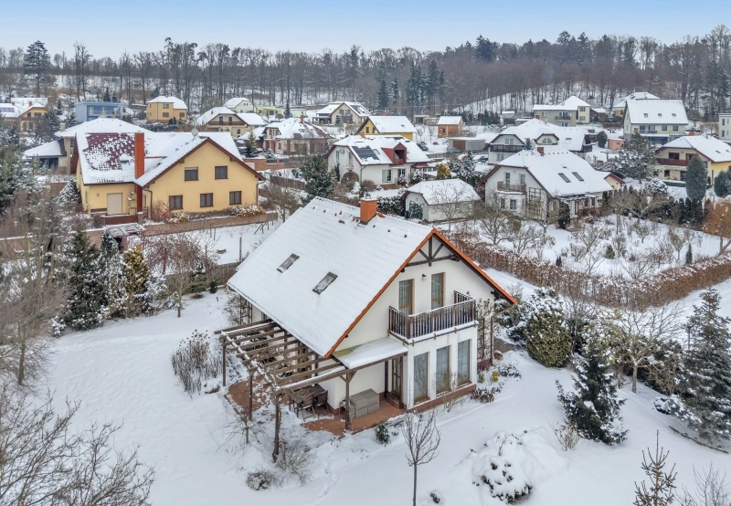 Nemovitost byla postavena ze železobetonové molitické konstrukce KEWO-LITH se zateplením. Vytápění objektu zajišťuje plynový kotel s rozvodem do radiátorů a podlahy a také krbová kamna v obývacím pokoji. Je také instalován centrální vysavač. Podlahy v obou patrech jsou z pravých voskovaných parket. Pozemek je kompletně oplocen a v přední části je el. posuvná brána na dálkové ovládání, branka ke vchodu a druhá záložní brána pro zpřístupnění zahrady technikou. V zadním rohu pozemku je postaven zděný zahradní domek s krytým přístřeškem. Z obývacího pokoje je přístup na velkou terasu s pergolou. Před dvougaráží je parkovací plocha pro návštěvy.