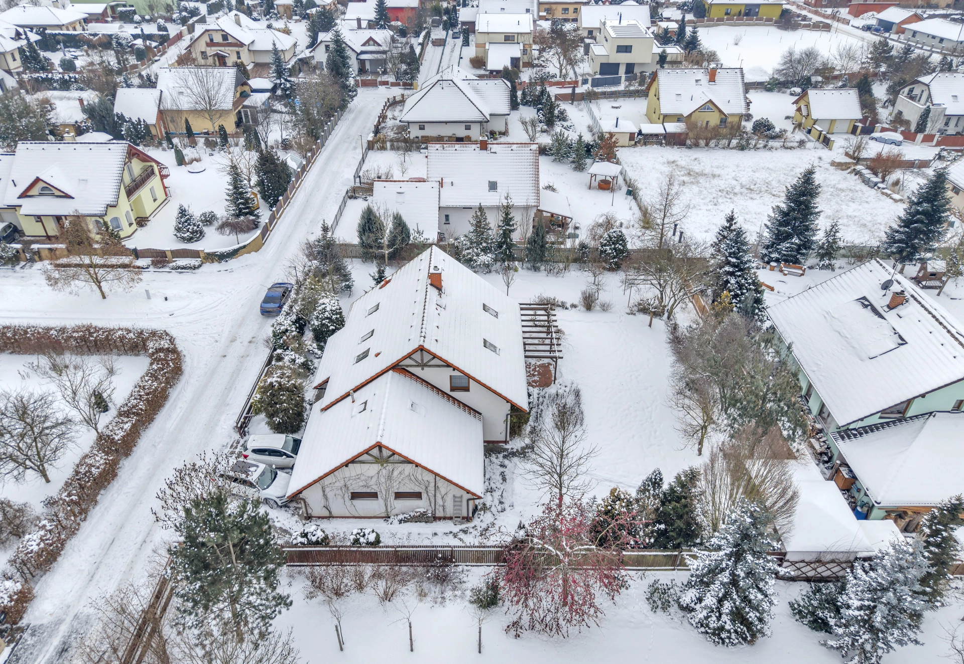 Nemovitost stojí na mírně svažitém pozemku orientovaném na jih o celkové výměře 1100 m2 s vzrostlou zelení. K dispozici jsou veškeré dostupné inženýrské sítě (elektřina, plyn, vodovod, splašková i dešťová kanalizace, internet).