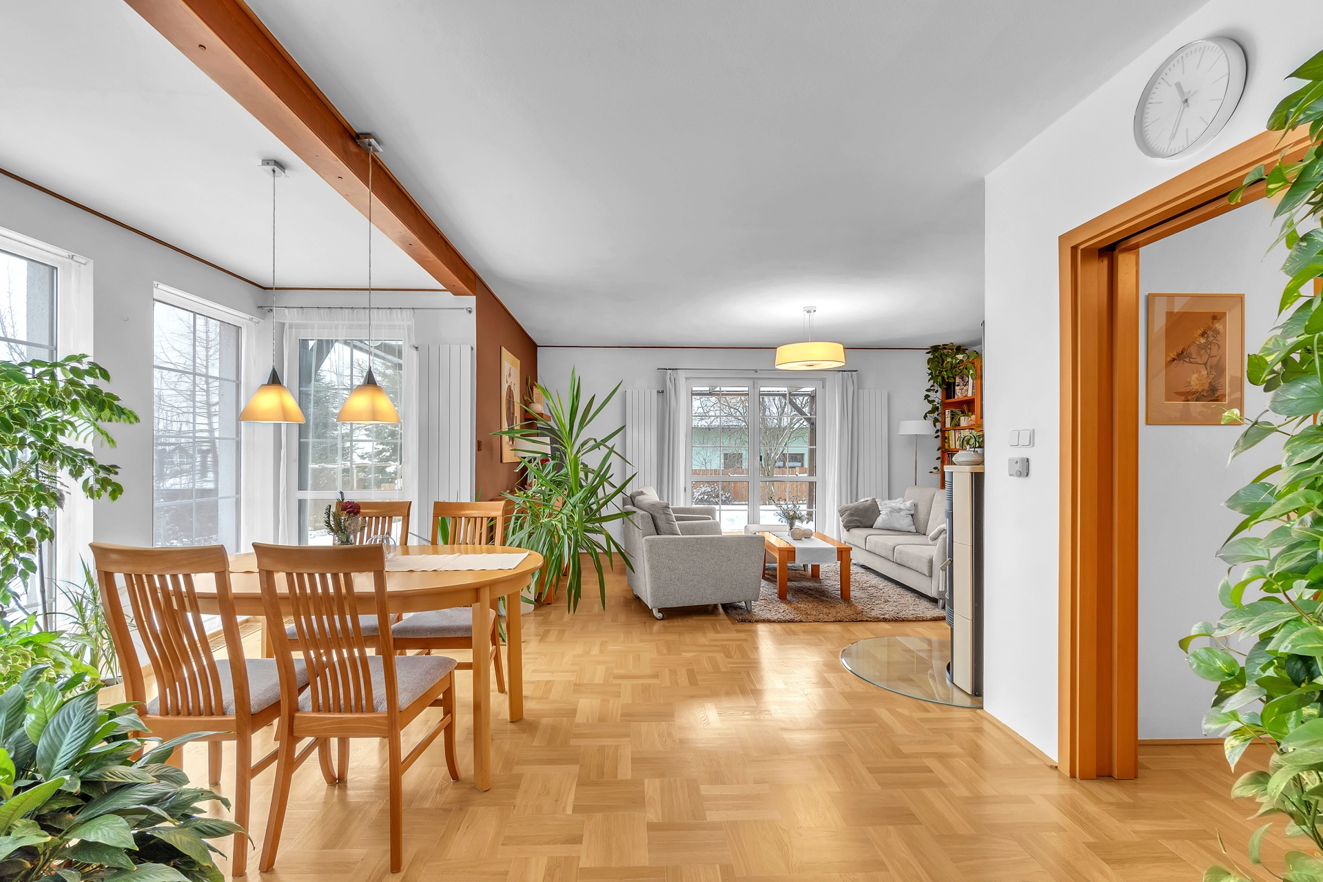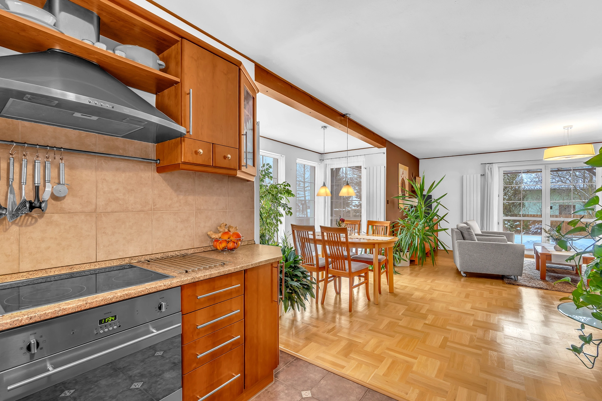 Přízemí - zádveří, WC, hala s botníkem a schodištěm do 1.patra, obývací pokoj s jídelnou a kuchyňským kouterm, ložnice, komora, koupelna s vanou i sprchovým koutem, WC a bidetem, spojovací úložná místnost do garáže pro dva automobily, jejíž součástí je také technická místnost a dílna se vstupem na zahradu.