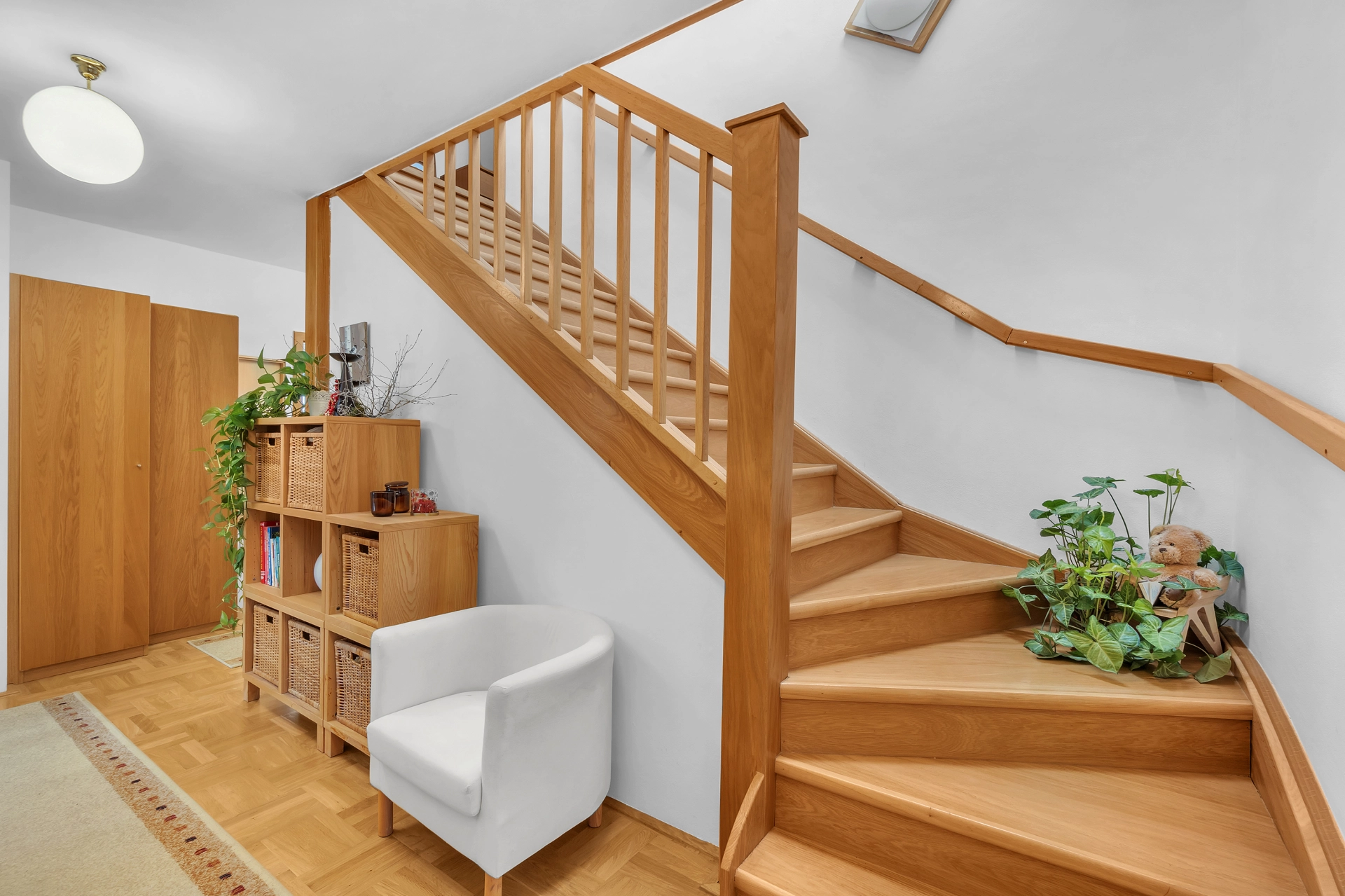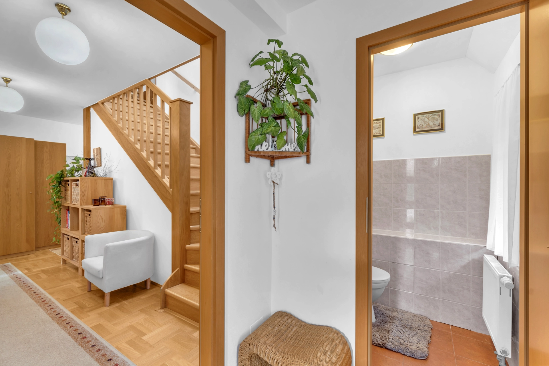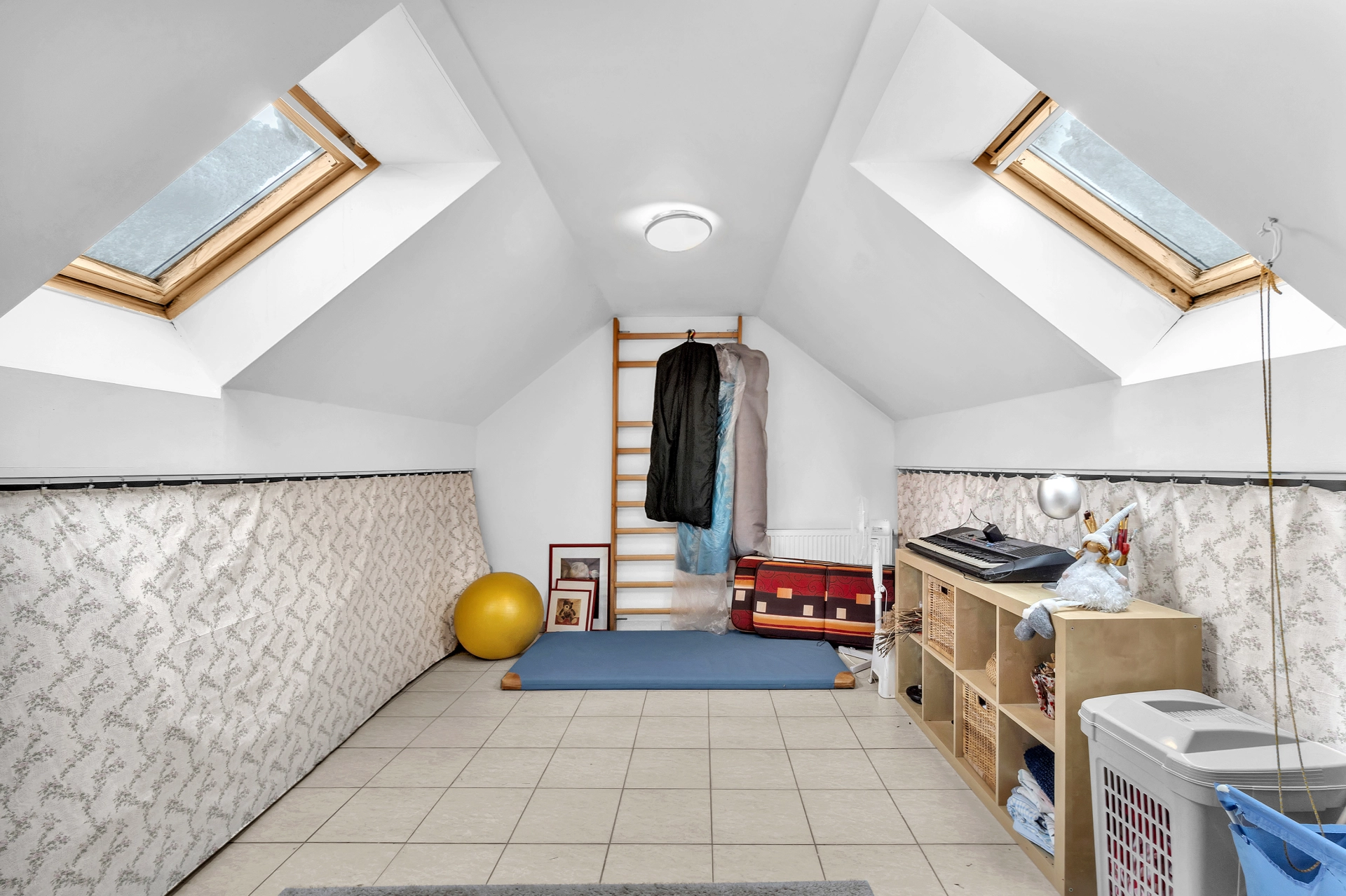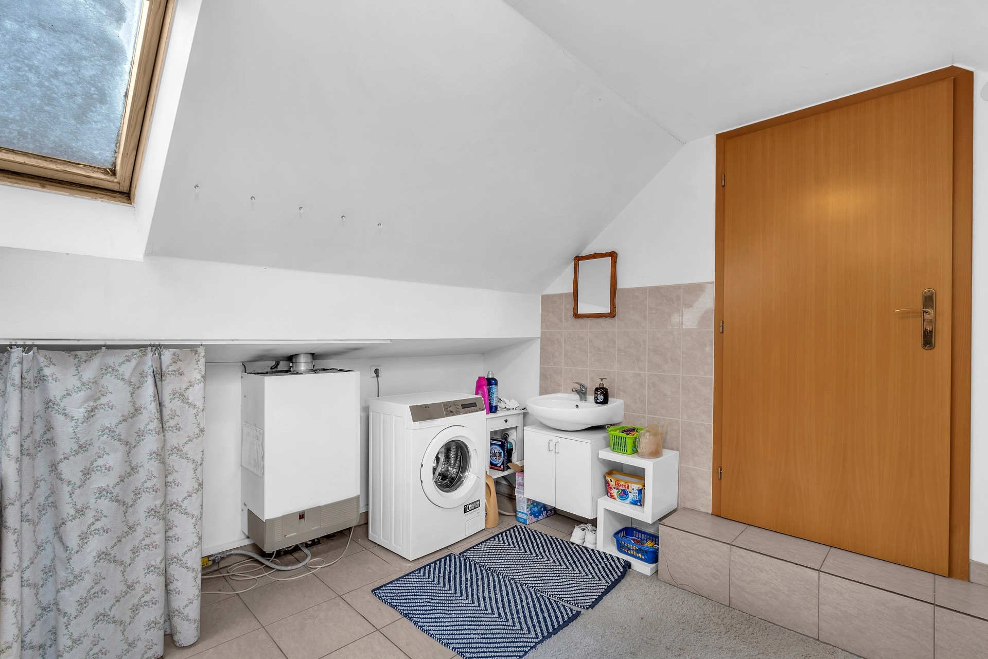 1.NP - chodba se vstupem na úložnou půdu, pokoj pro hosty/pracovna, 2x dětský pokoj, koupelna s WC a velká technická místnost s úložným prostorem, plynovým kotlem a pračkou.