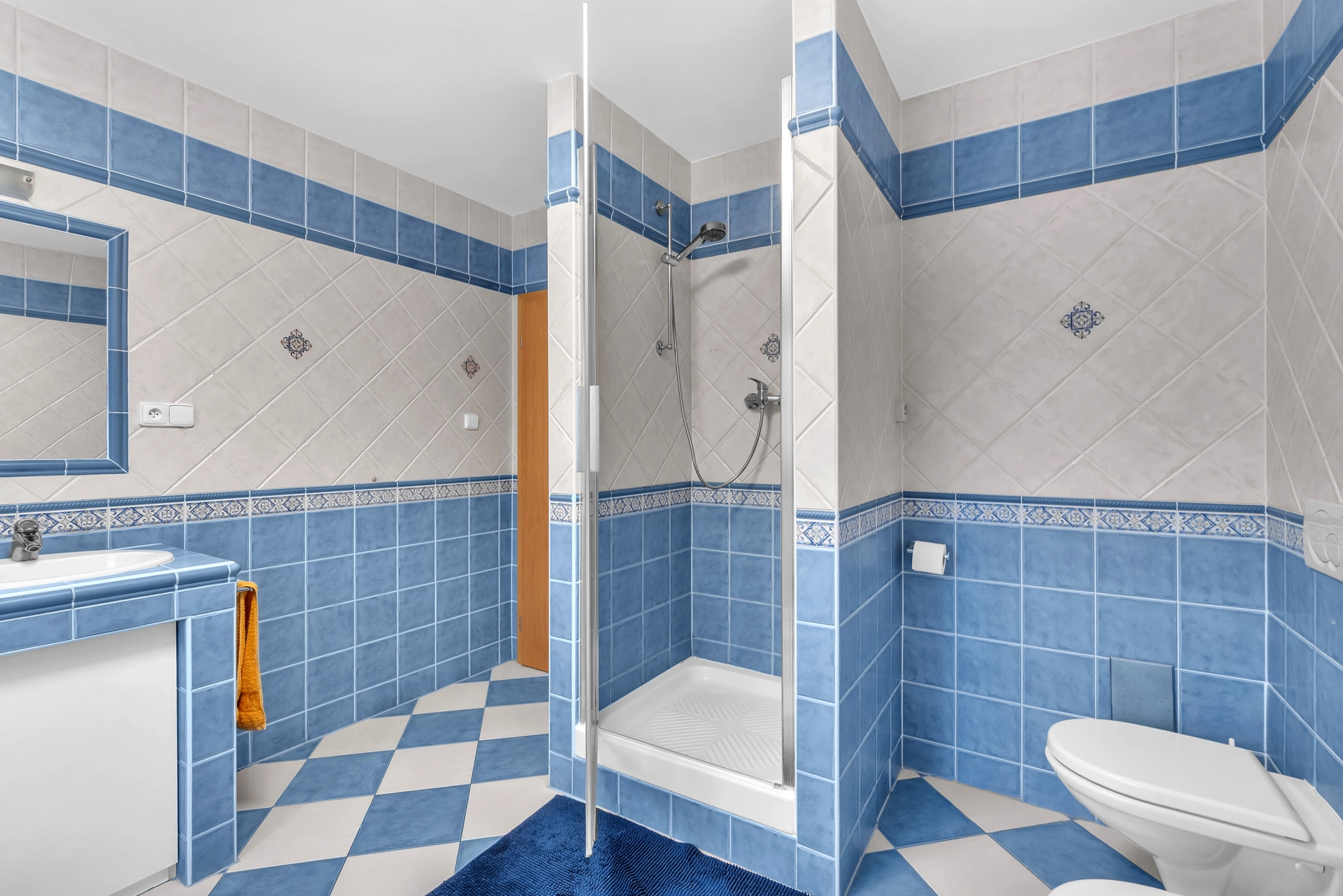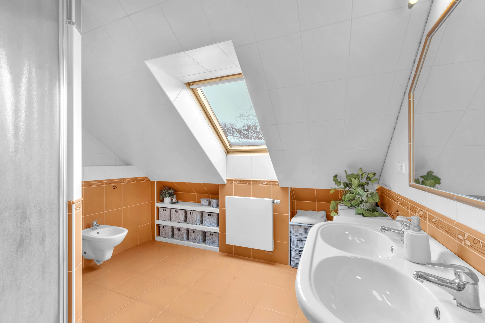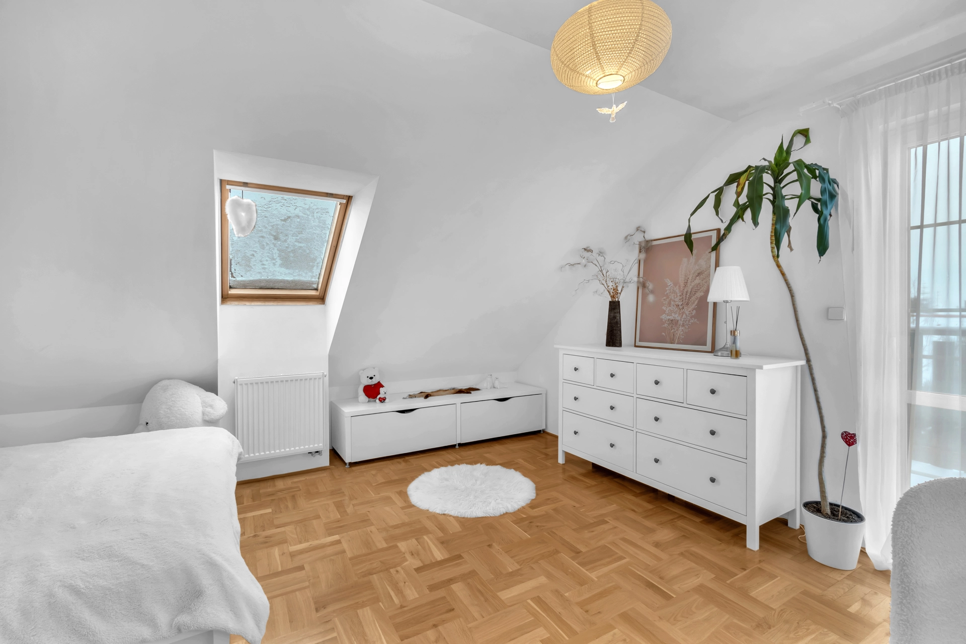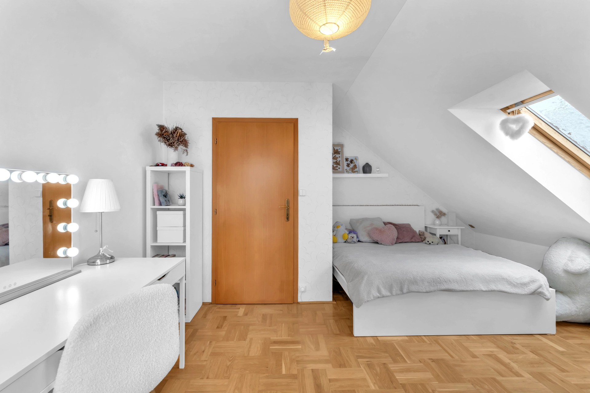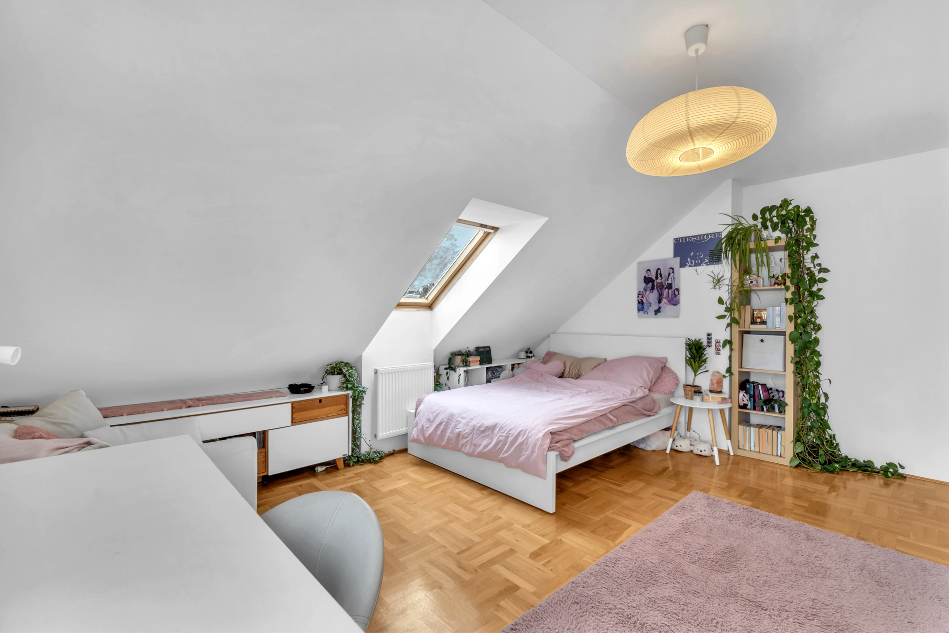1.NP - chodba se vstupem na úložnou půdu, pokoj pro hosty/pracovna, 2x dětský pokoj, koupelna s WC a velká technická místnost s úložným prostorem, plynovým kotlem a pračkou.