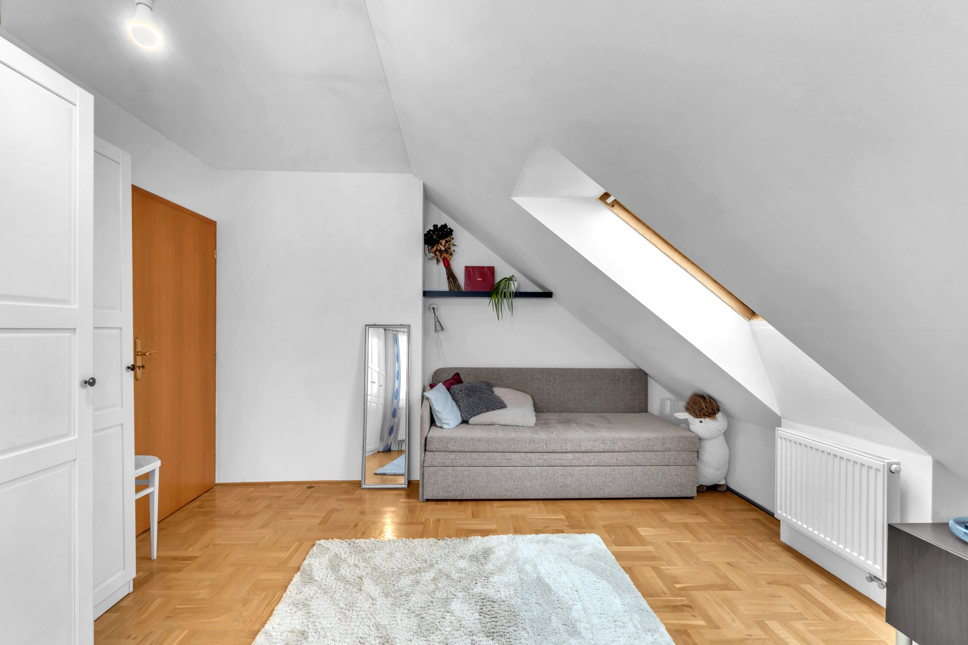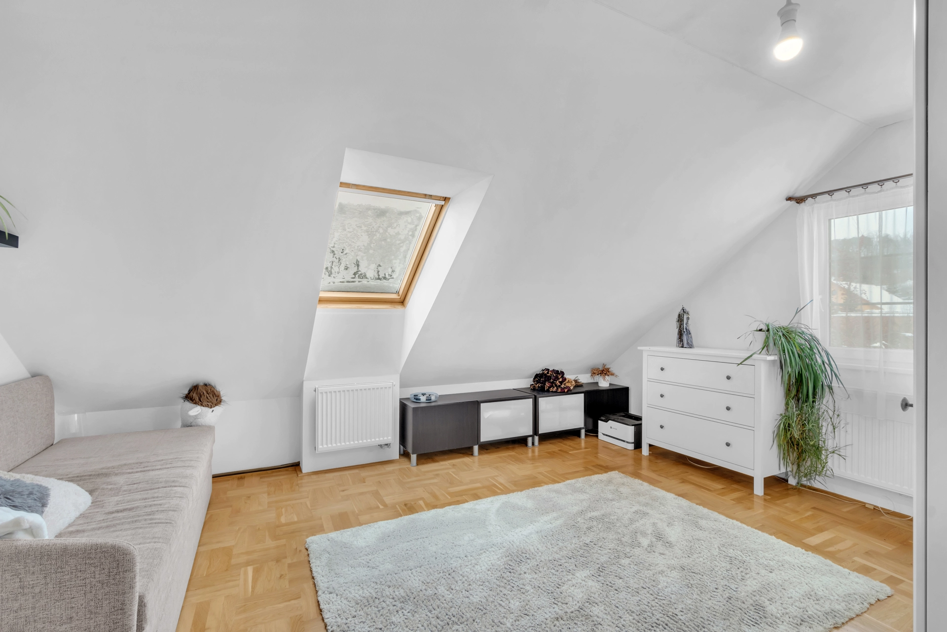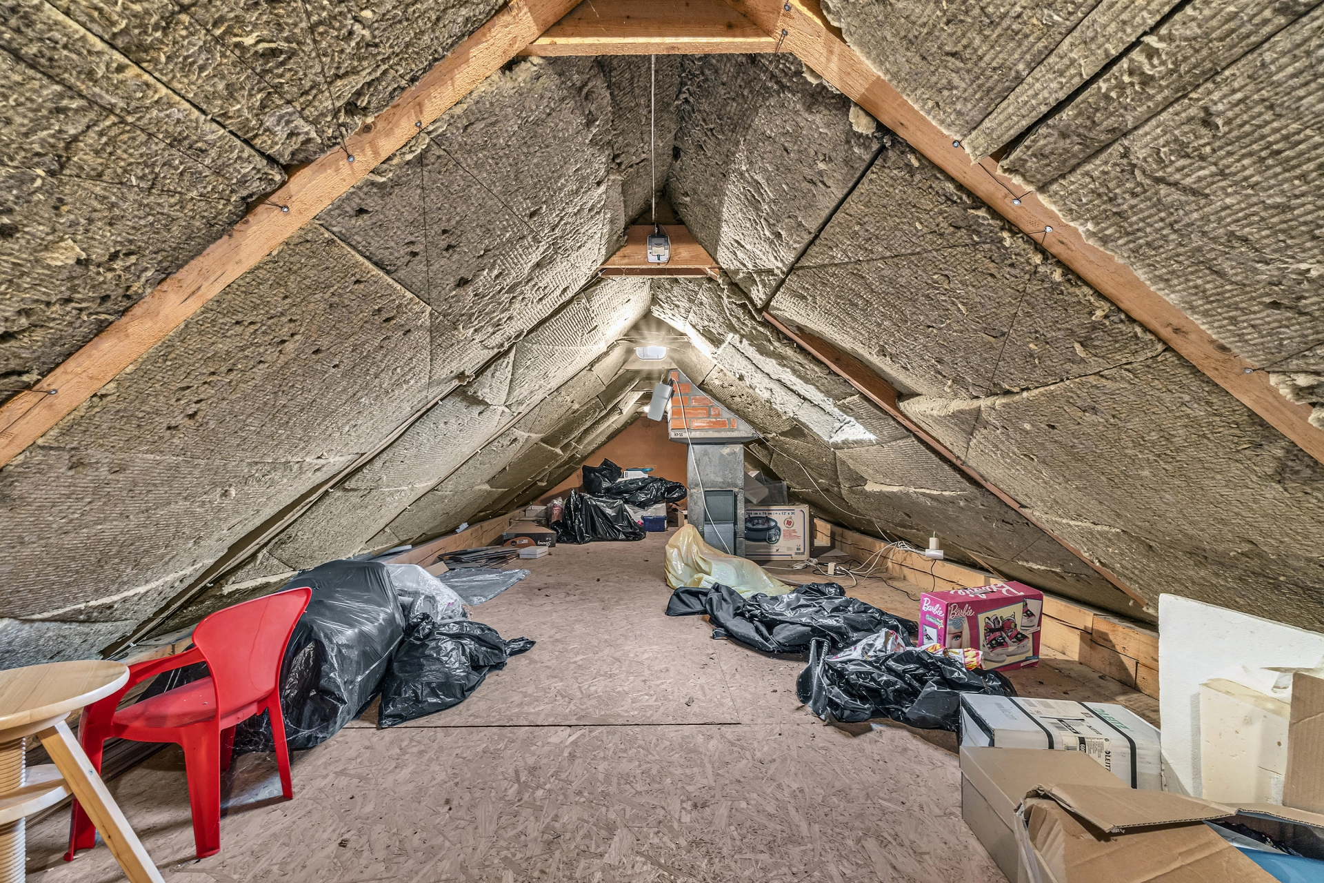 Půda - zateplený úložný prostor s přístupem na střechu ke komínu a anténě.