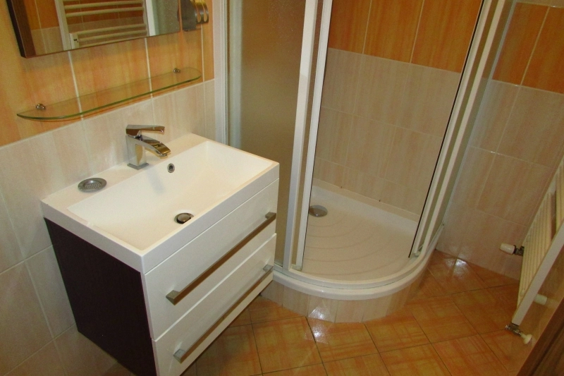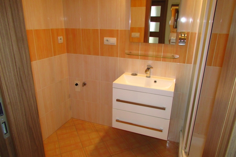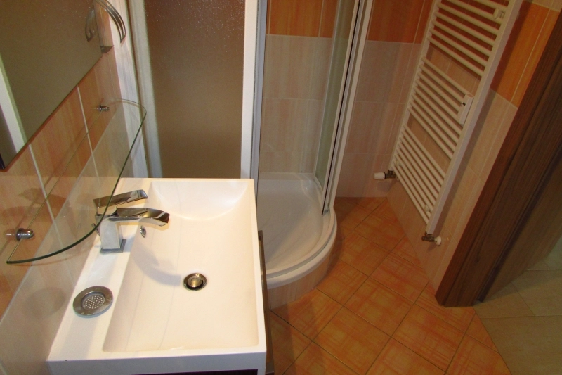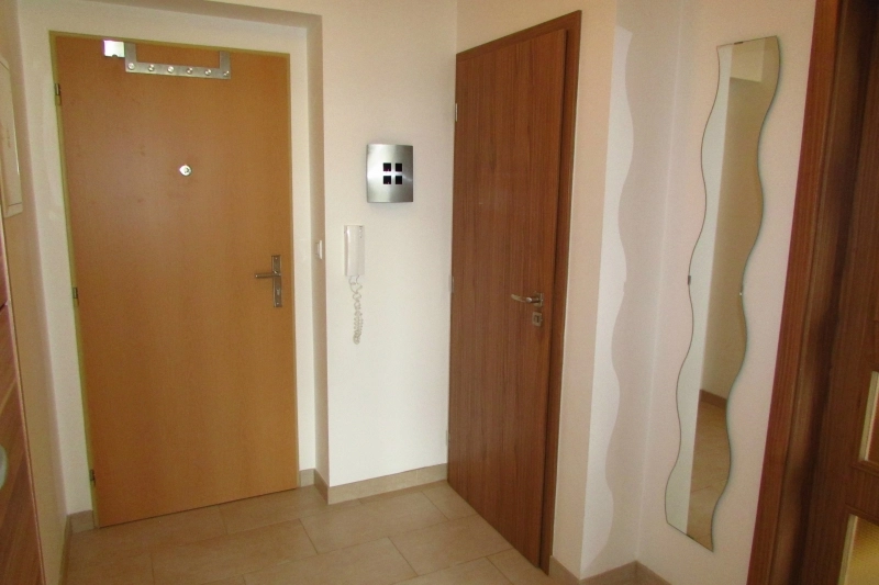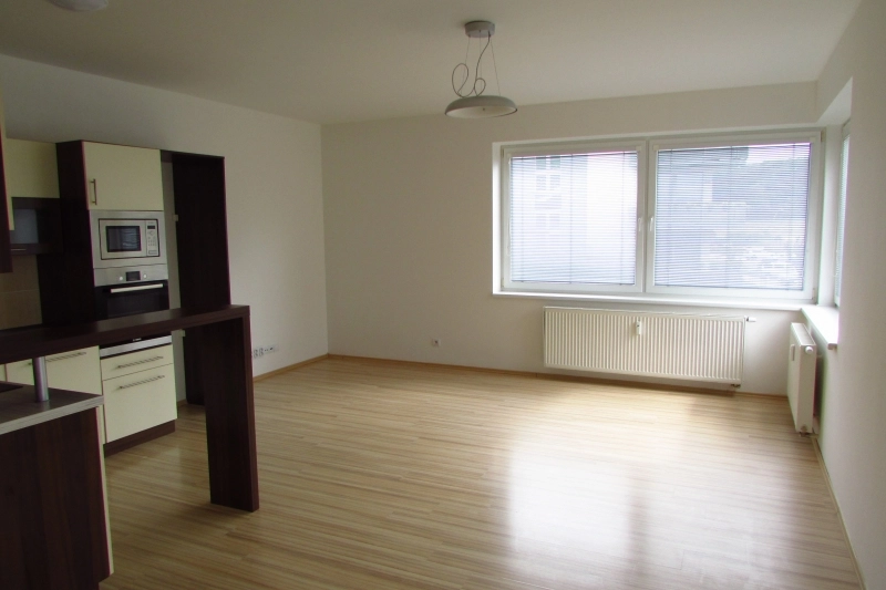 Dispozice: chodba s botníkem, koupelna se sprochým koutem, WC, ložnice, obývací pokoj s kuchyňským koutem (myčka, trouba, varná deska, digestoř, mikrovlná trouba) a vstupem na krytou terasu, která je orientována na jiho-západ a sklep ve stejném patře jako je byt. Veškeré služby jsou k dispozici v místě nebo v docházkové vzdálenosti (Supermarket PENNY, pošta, MHD, ZŠ, MŠ). V bytě je k dispozici elektřina, voda, topení a ohřev vody dálkově, TV anténa, možnost internetu.