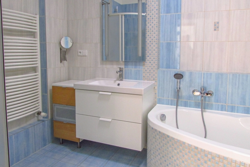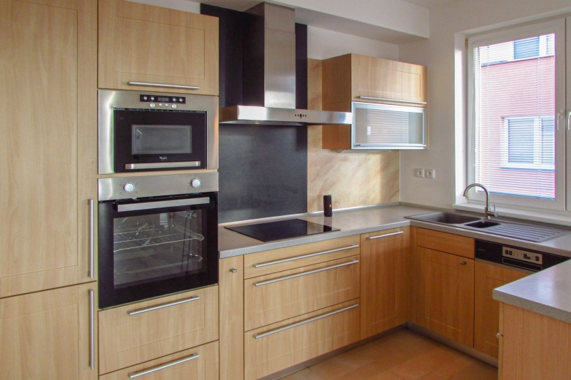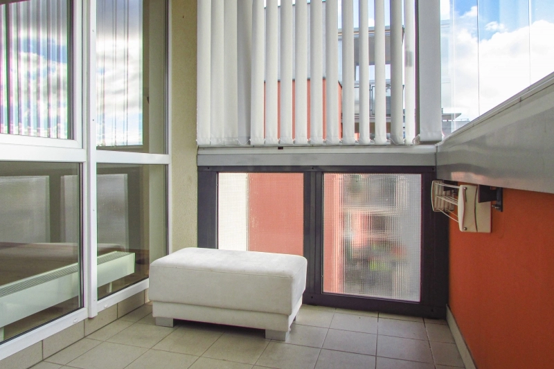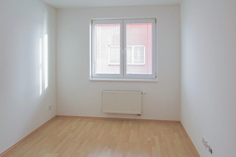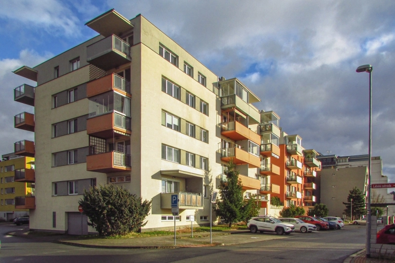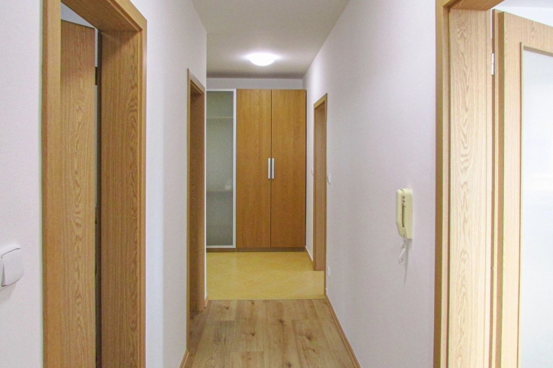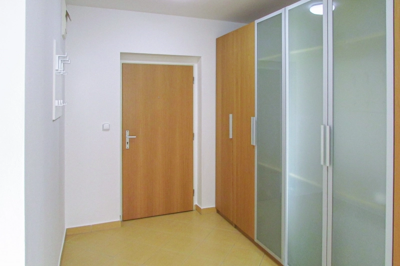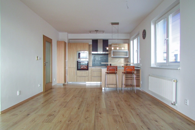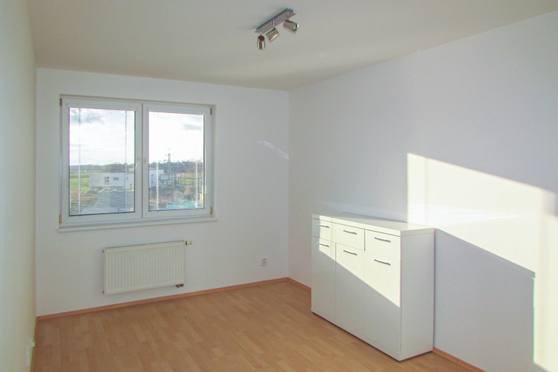 Dispozice: chodba s velkou vestavěnou skříní, koupelna s vanou a sprchovým koutem, WC, ložnice, pracovna/dětský pokoj, a obývací pokoj s kuchyňským koutem, barovým pultem a vstupem na zasklenou terasu, která je orientována na západ. K dispozici je také garážové stání pro jedno auto v suterénu budovy. Veškeré služby jsou k dispozici v místě nebo v docházkové vzdálenosti (Supermarket, pošta, MHD, ZŠ, MŠ). V bytě je k dispozici elektřina, voda, topení a ohřev vody dálkově, TV anténa, možnost internetu. Byt je částěčně vybaven nábytkem viz fotogalerie.