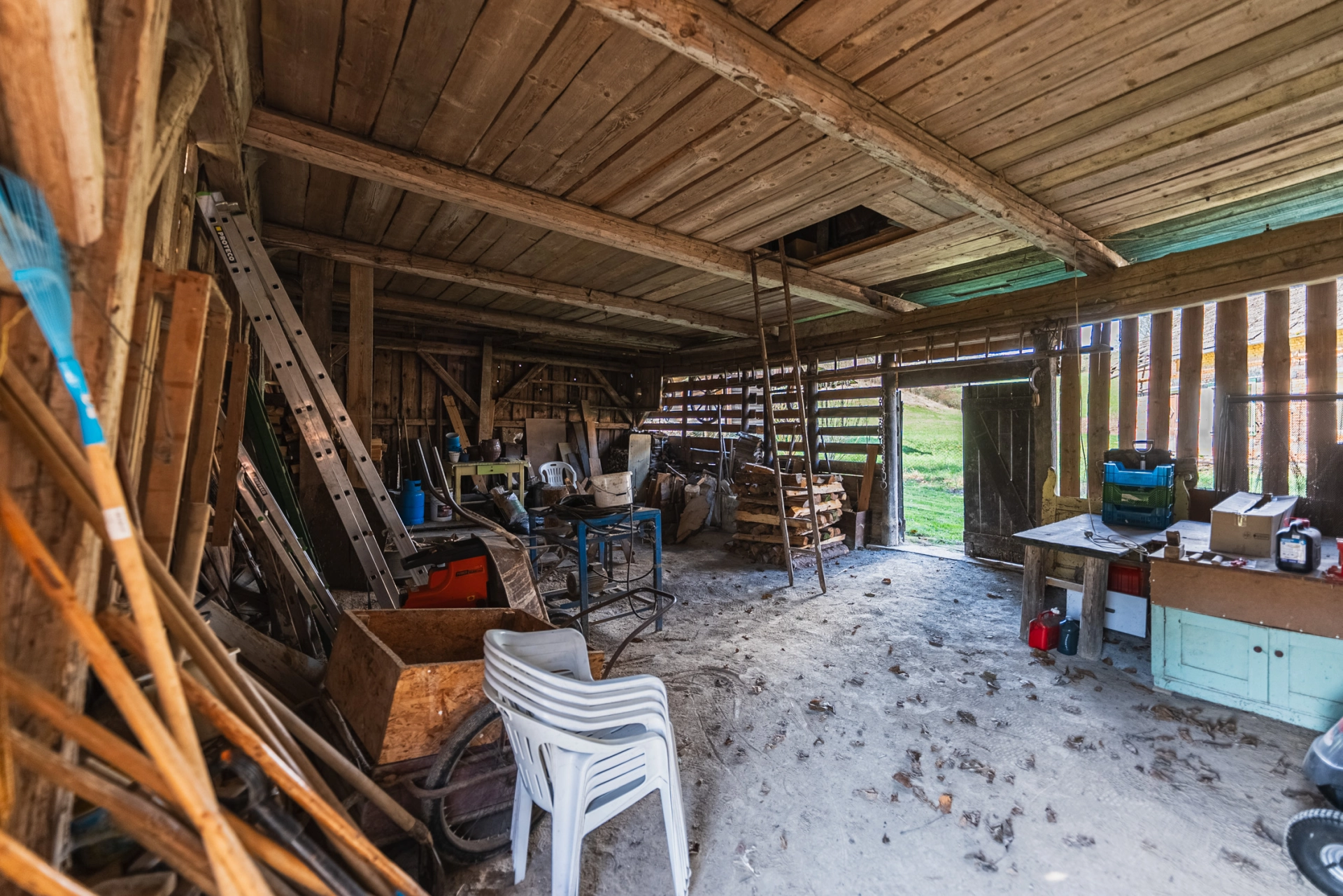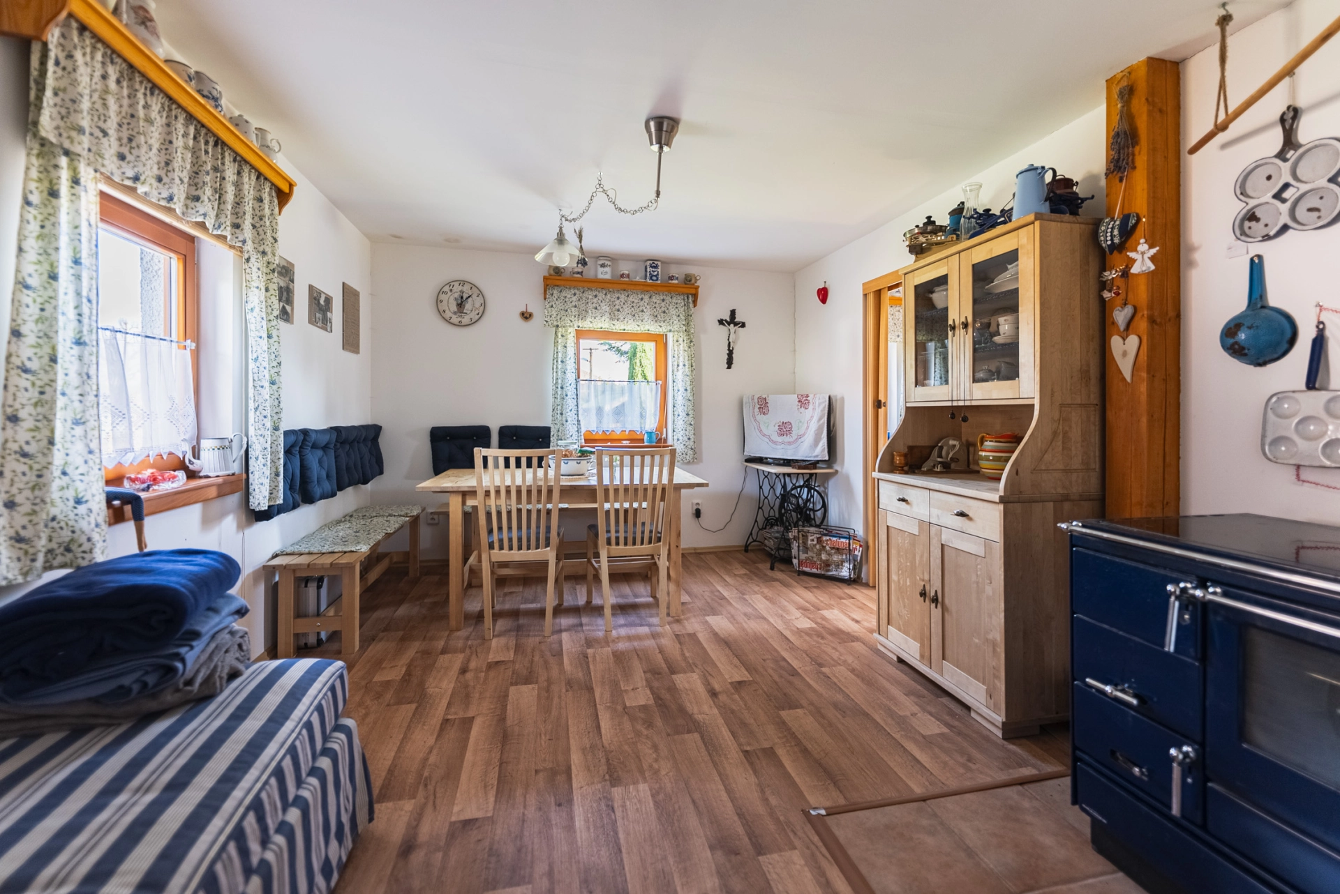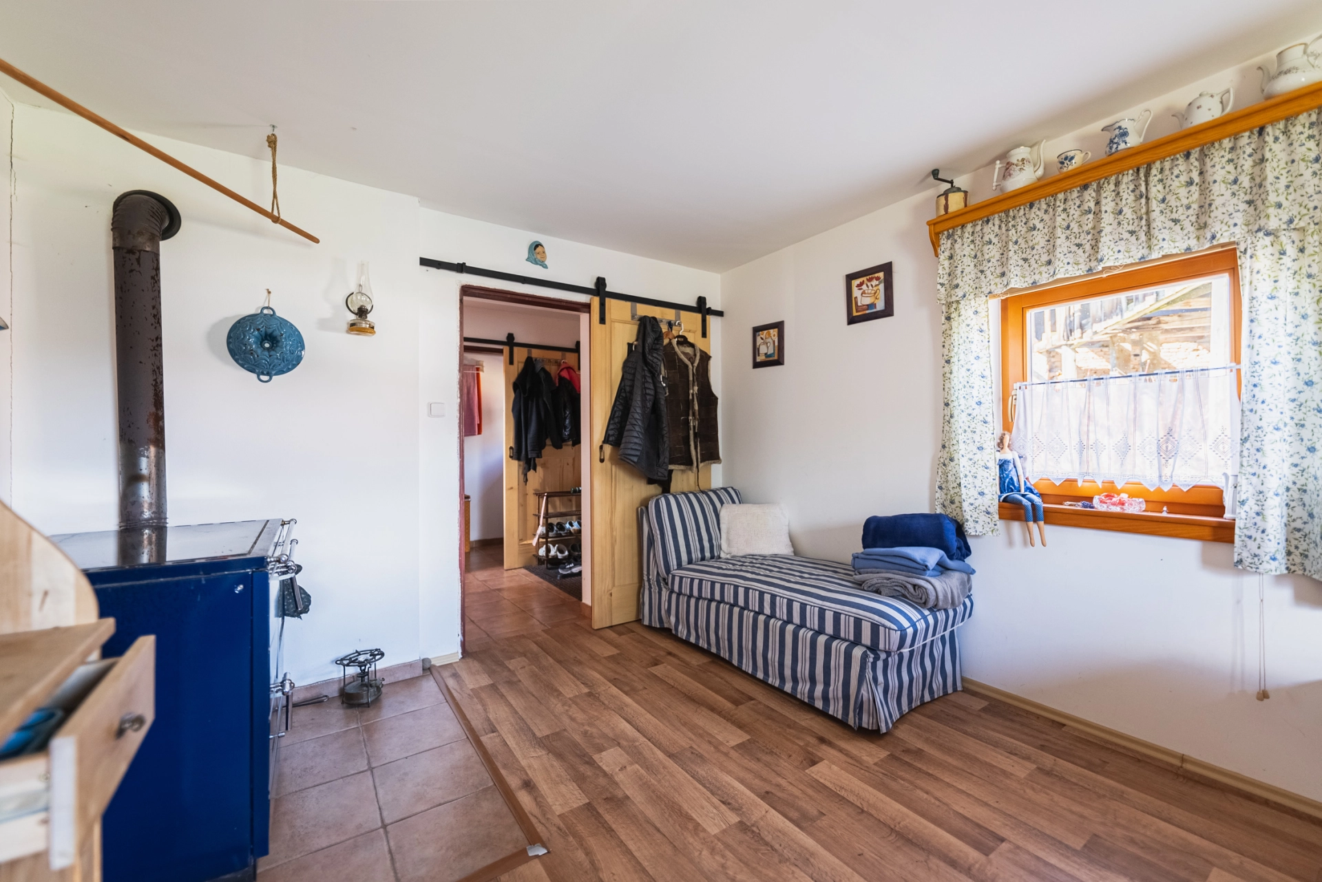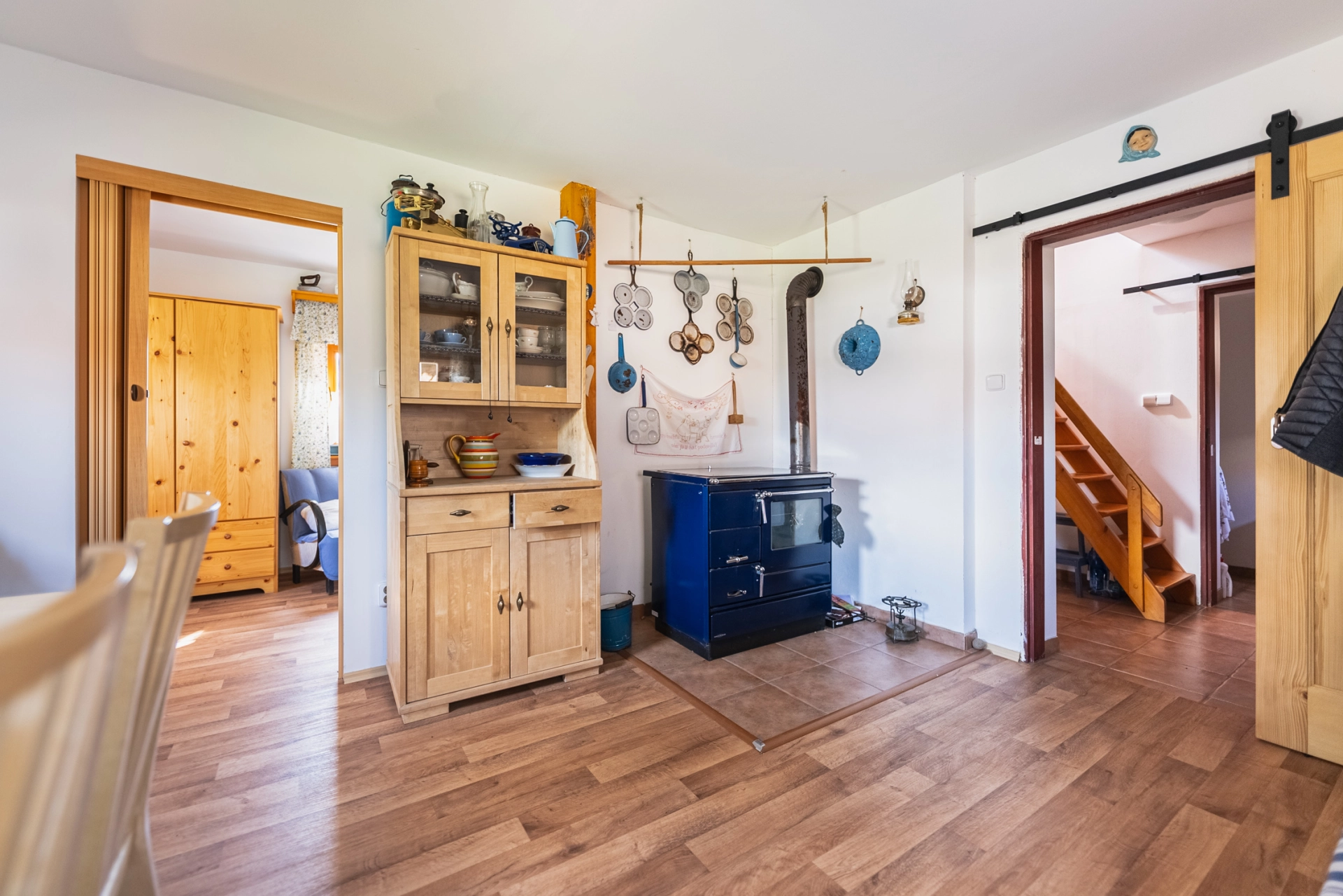 Přízemí – chodba se vstupem do místností a na schodiště, koupelna se sprchovým koutem a WC, kuchyňka, obývací pokoj se smaltovanými kamny, ložnice, velká kůlna (sloužící jako dílna, dřevník, další využití), schodiště do podkroví. Podkroví – velká obytná místnost se dvěma střešními okny.