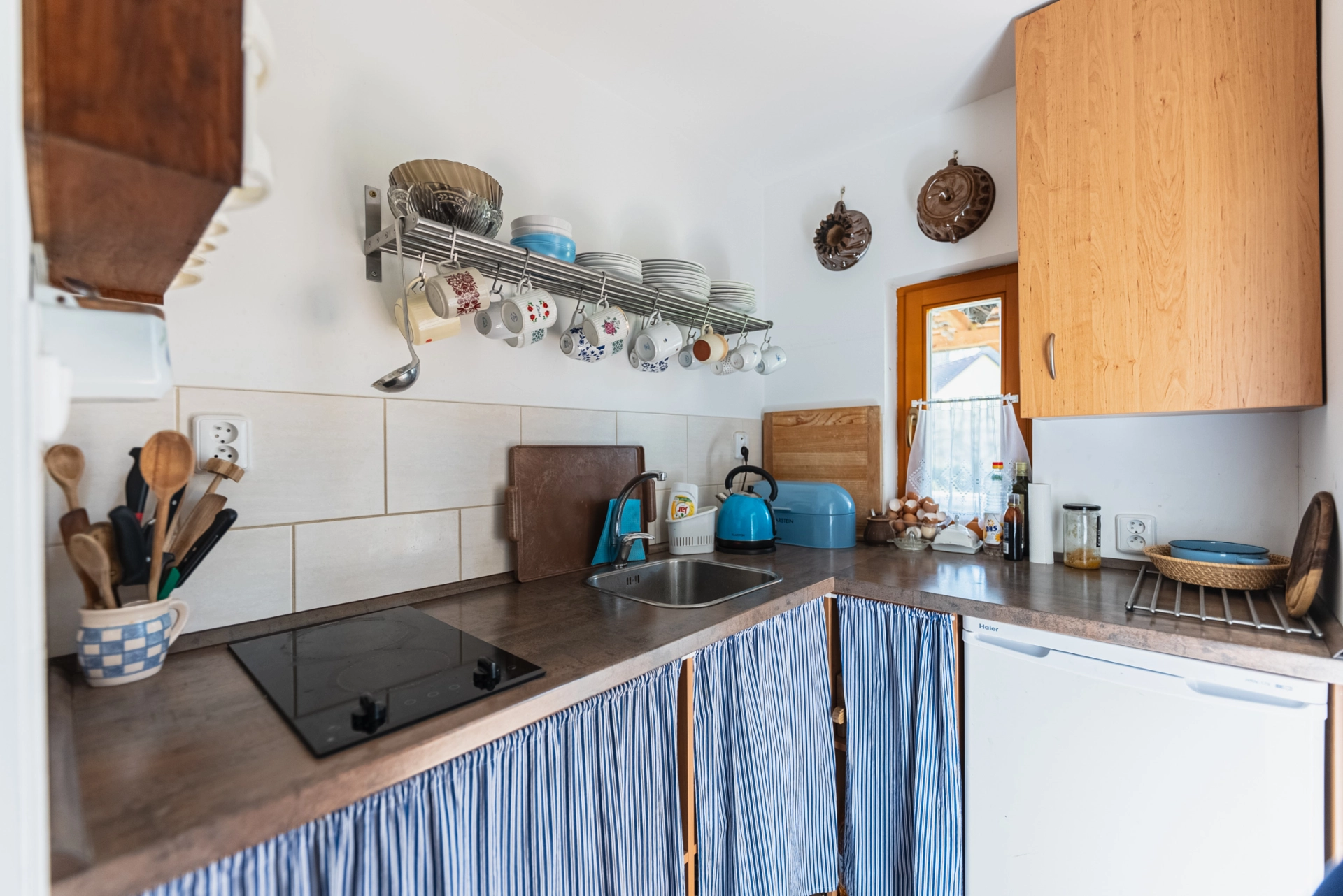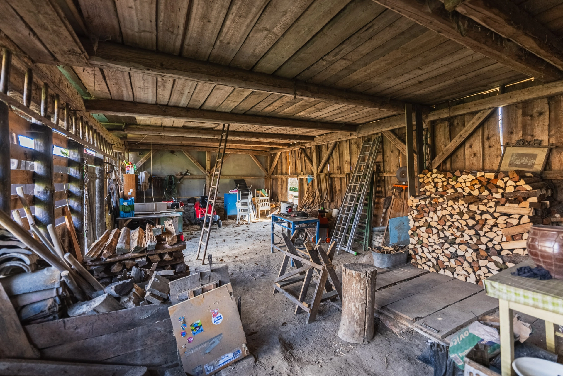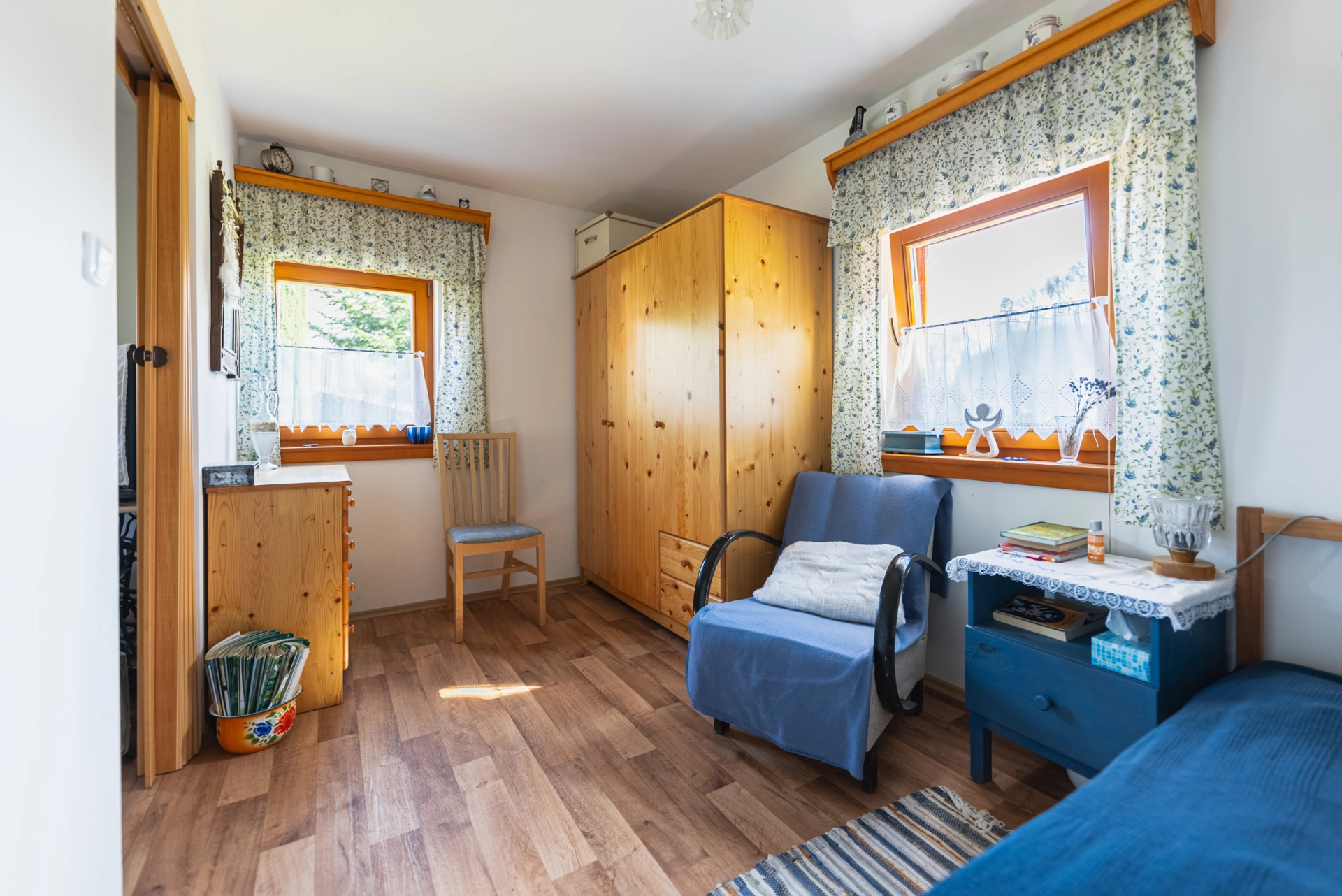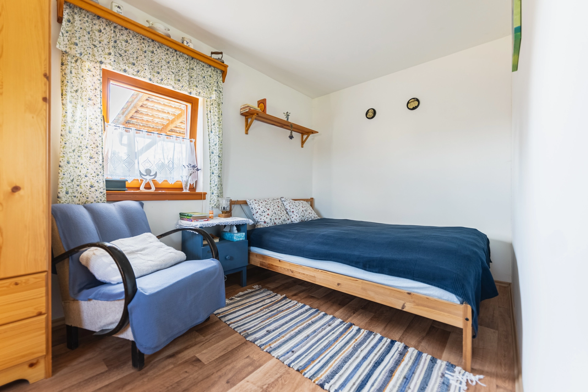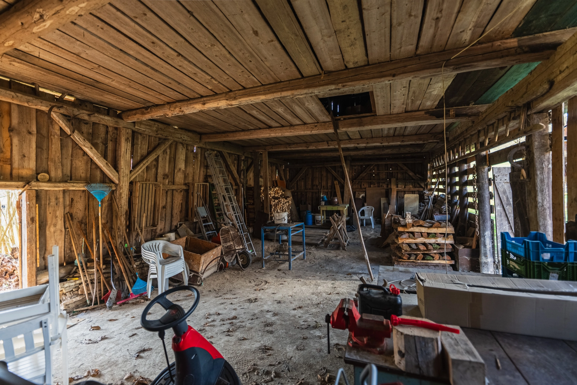Přízemí – chodba se vstupem do místností a na schodiště, koupelna se sprchovým koutem a WC, kuchyňka, obývací pokoj se smaltovanými kamny, ložnice, velká kůlna (sloužící jako dílna, dřevník, další využití), schodiště do podkroví. Podkroví – velká obytná místnost se dvěma střešními okny.