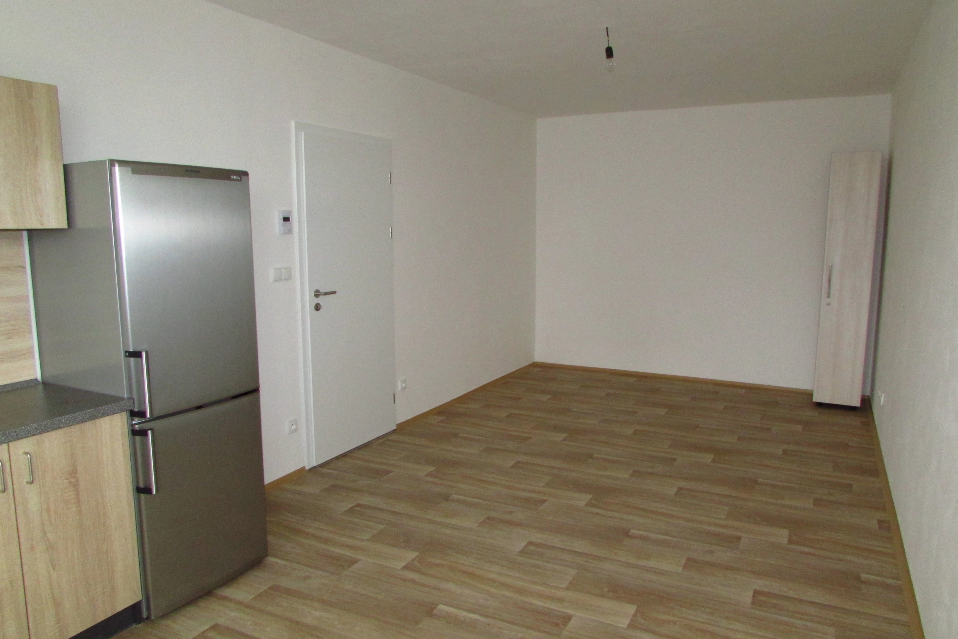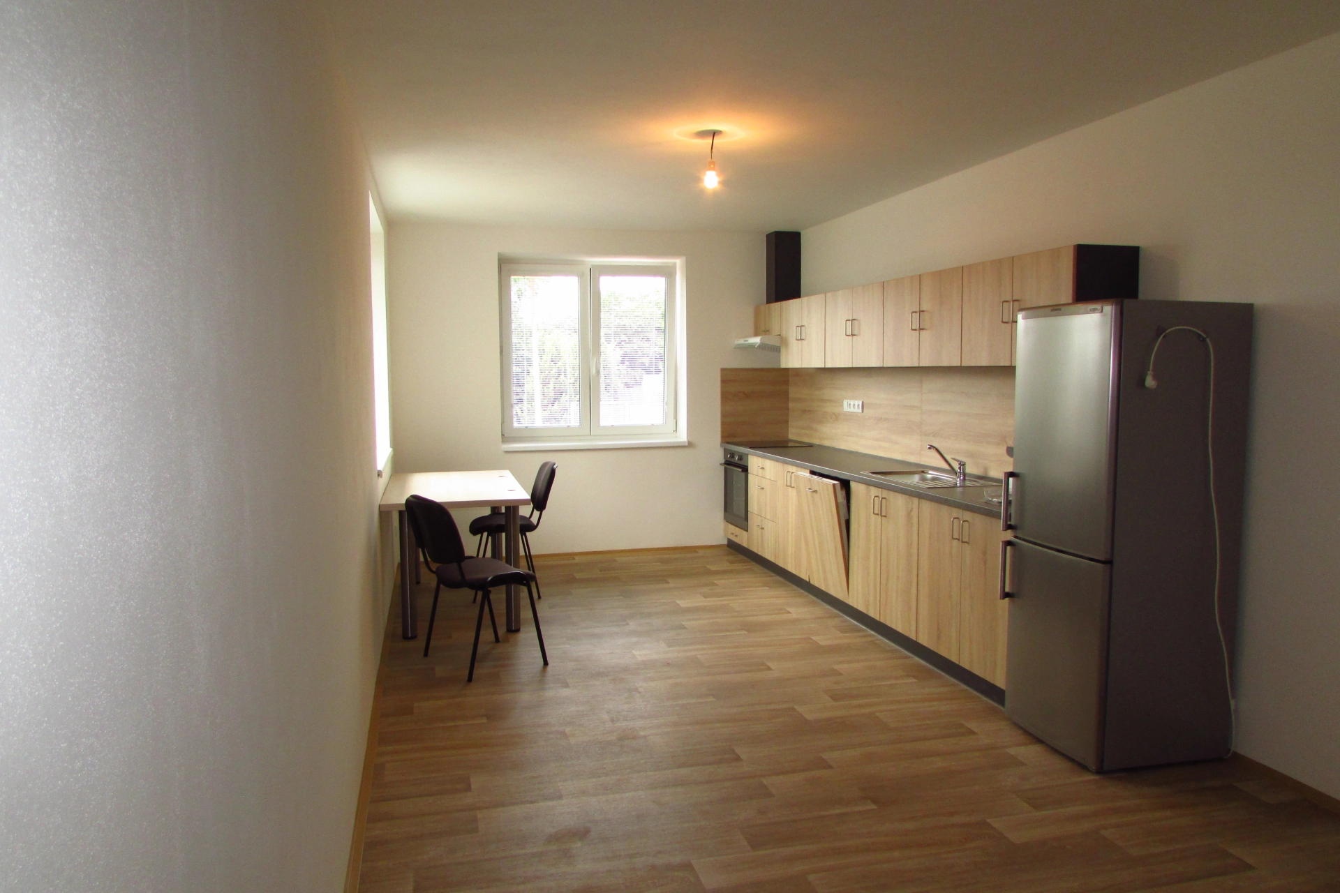 Dispozice jednotky: chodba, koupelna s WC a sprchovým koutem, místnost s kuchyňským koutem, druhá místnost a sklep. V místnostech jsou vinylové podlahy, v chodbě a koupelně dlažba.