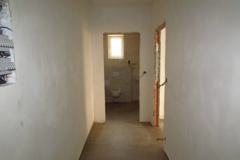 Dispozice jednotky: chodba, koupelna s WC a sprchovým koutem, místnost s kuchyňským koutem a prostorný sklep.
