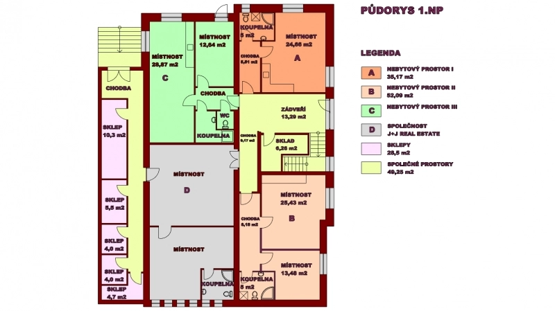 PRONAJATO. Nabízíme Vám exkluzivně k pronájmu novou nebytovou jednotku kategorie 2+kk (v půdorysu označena - C), která vznikne ve velmi žádané části Havlíčkova Brodu – v ulici Roháče z Dubé. Jednotka bude umístěna v přízemí nově zrekonstruované budovy a jeho vnitřní užitná výměra bude 53 m2 + sklep o výměře 4 m2. Stavební práce probíhají. Dokončení stavby je odhadováno na 30.04.2022.