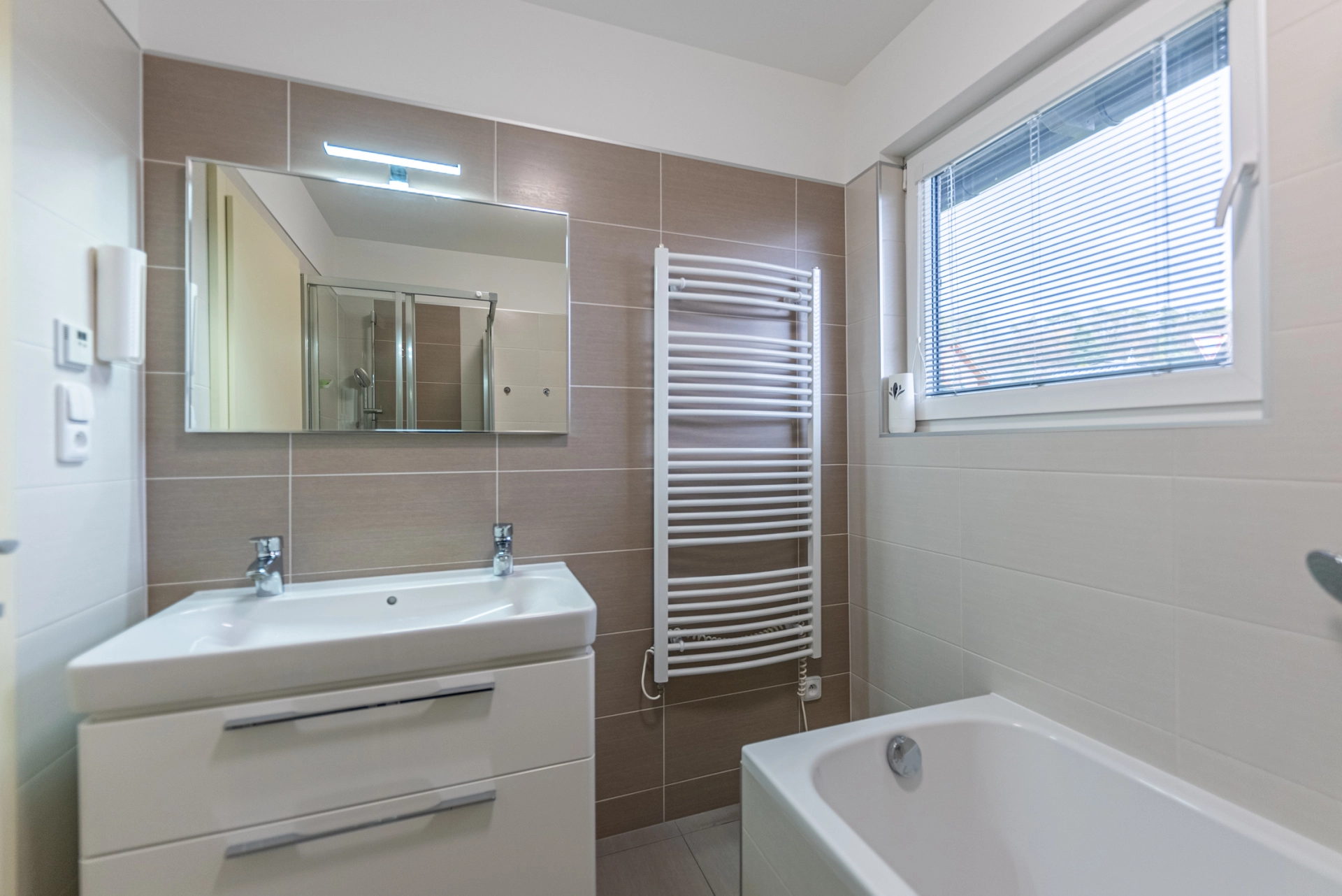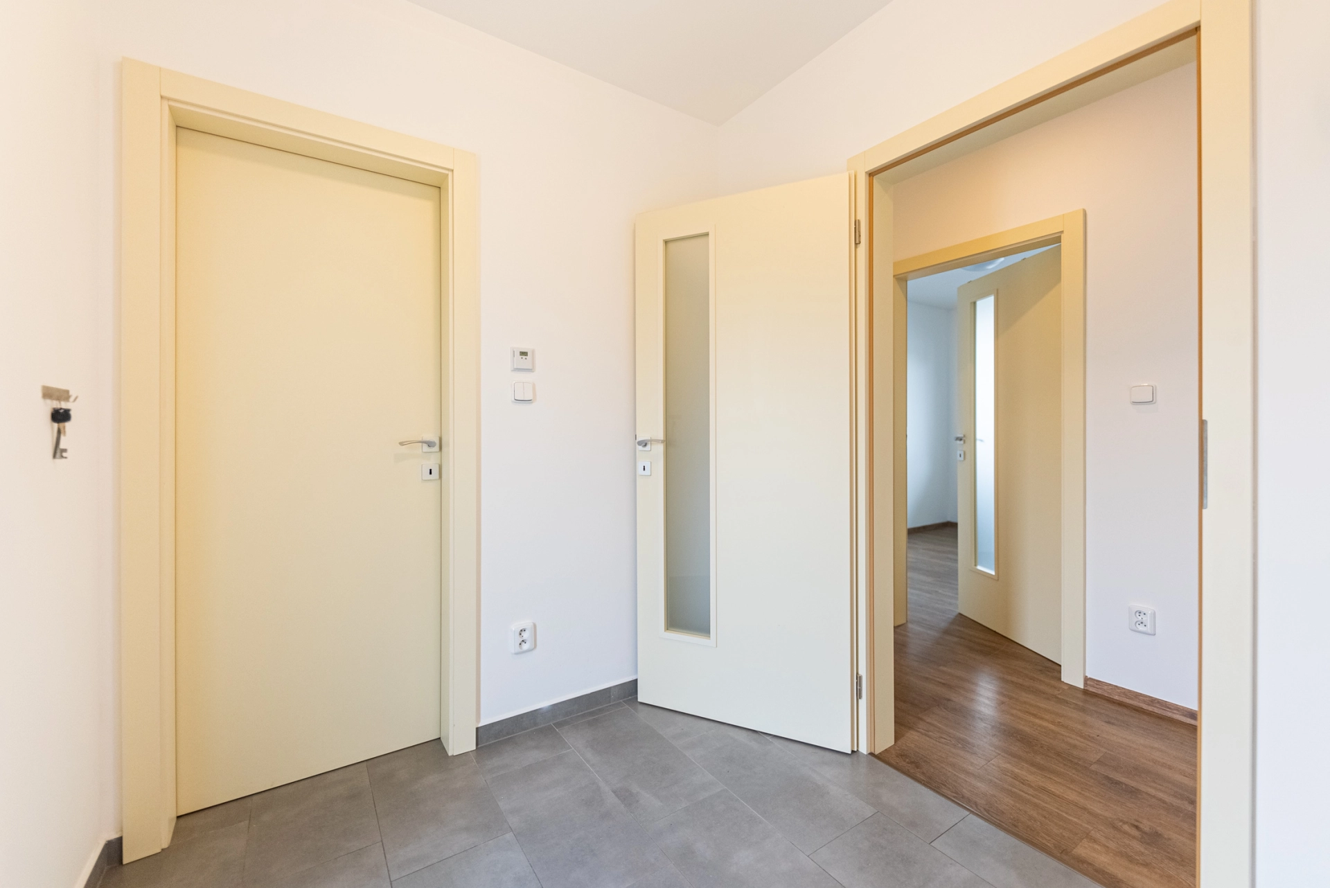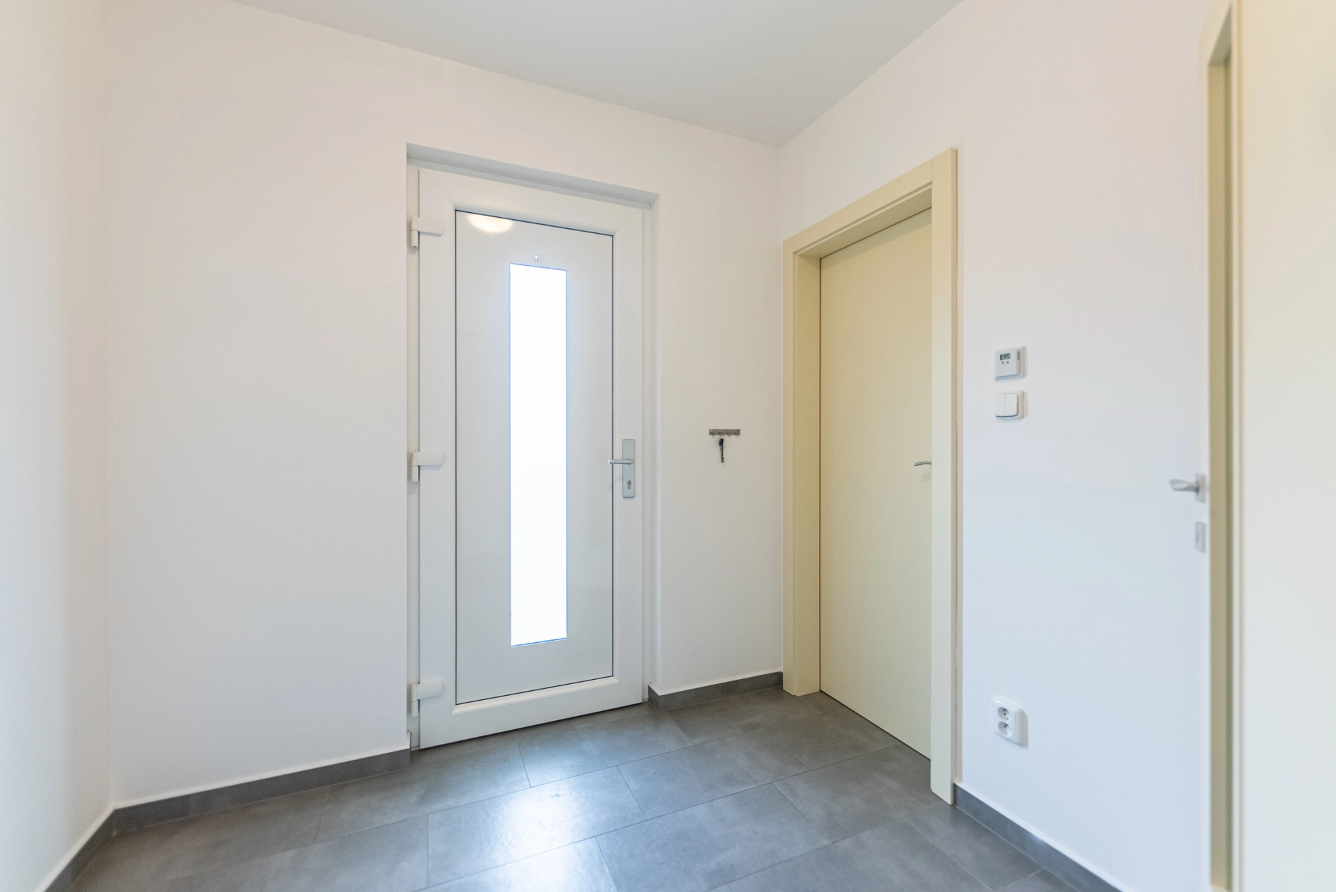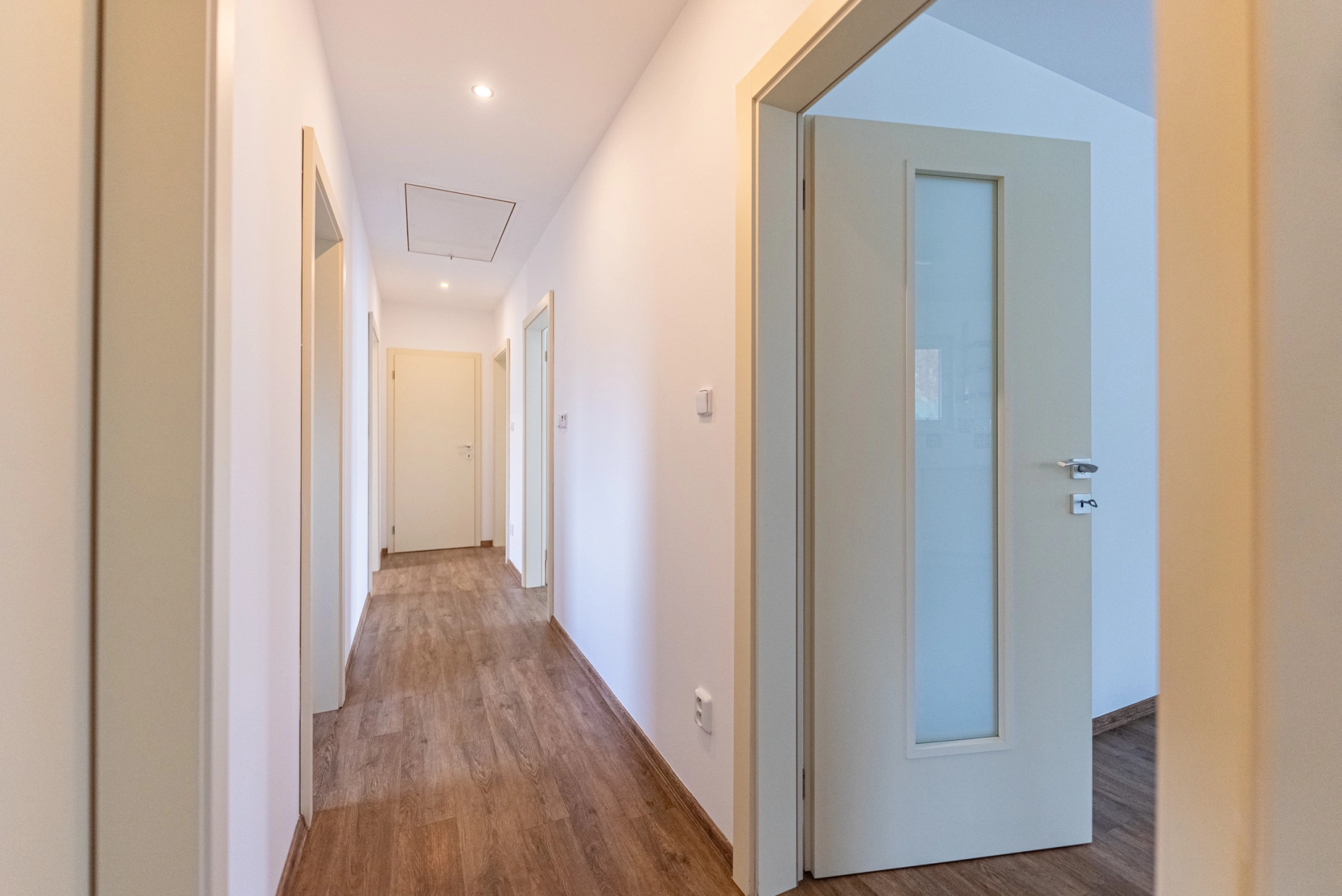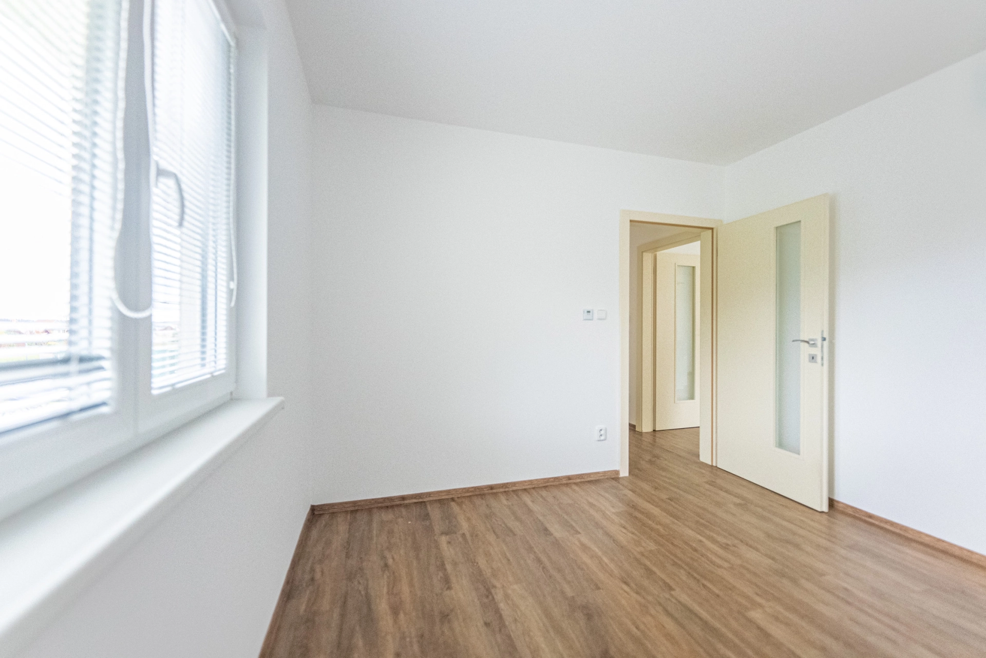 Dispozice: zádveří s komorou, chodba se vstupem úložnou půdu, technická místnost s bojlerem a místem pro pračku a sušičku, dětský pokoj/pracovna, ložnice, koupelna s vanou a sprchovým koutem, WC, pokoj, obytná místnost s kuchyňským koutem, terasa.