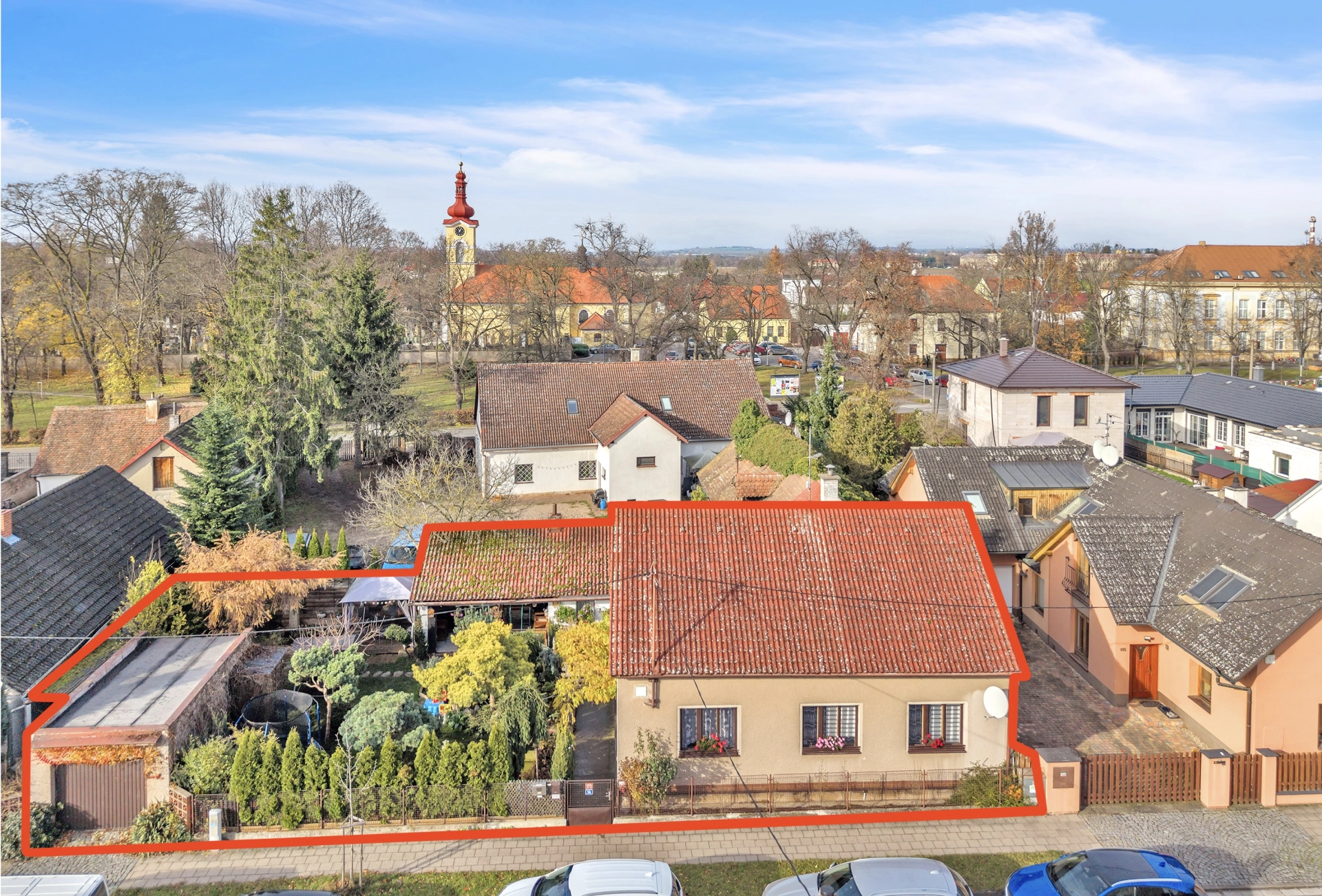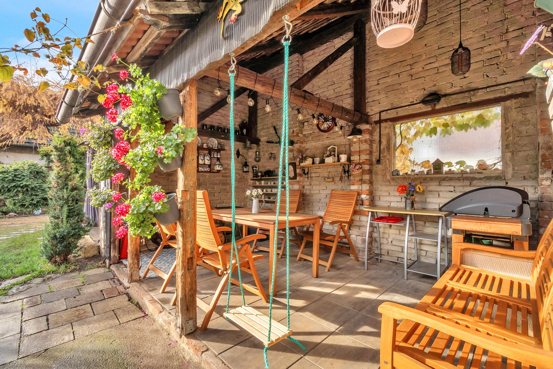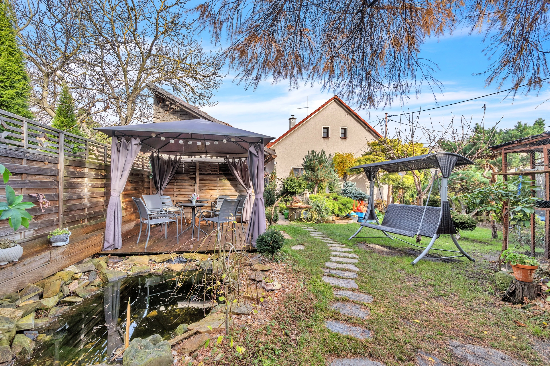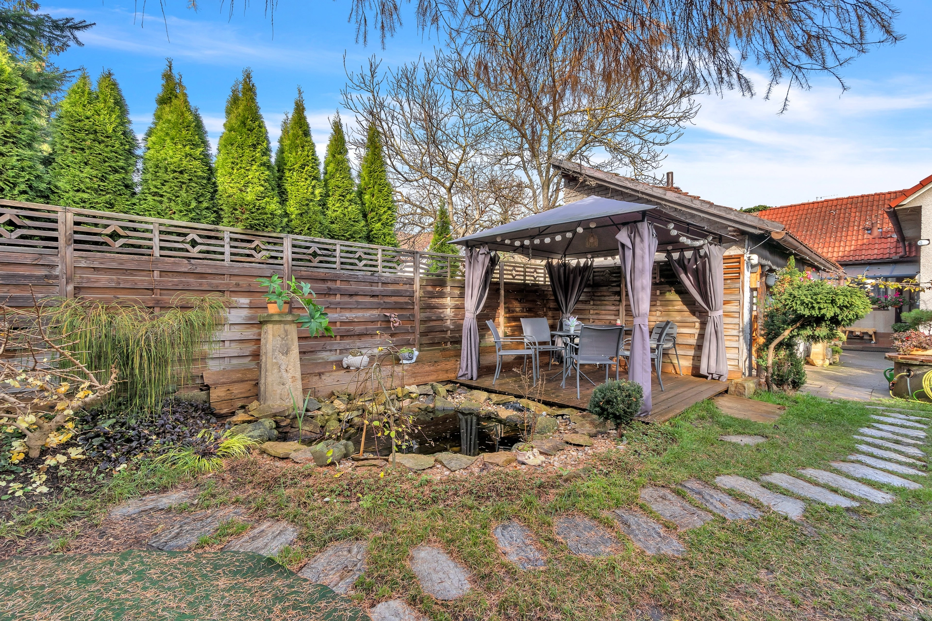 Parkování - garáž a v ulici před domem. Zahrada s jezírkem, dvě terasy, venkovní sklad a studna s užitkovou vodou.