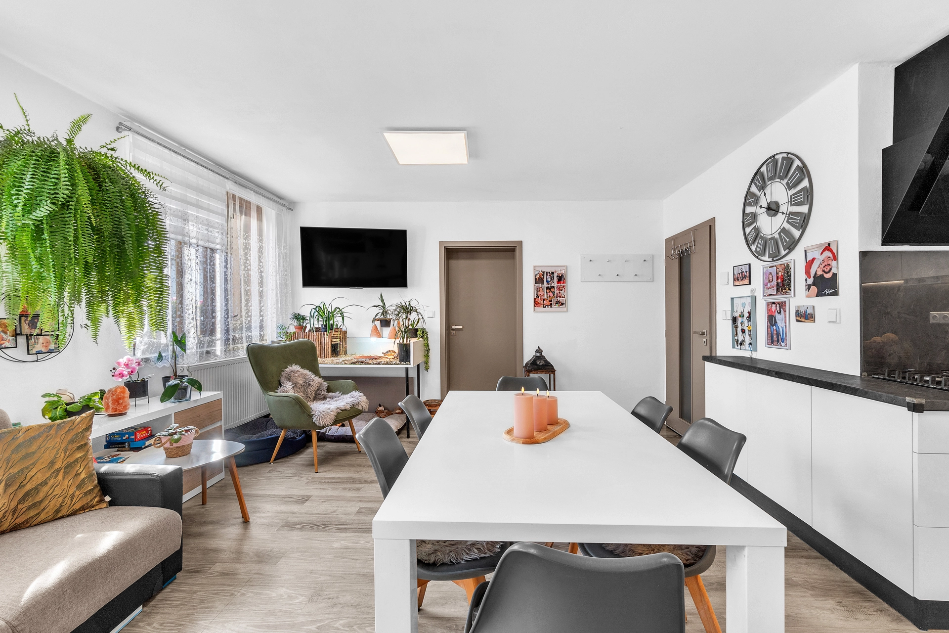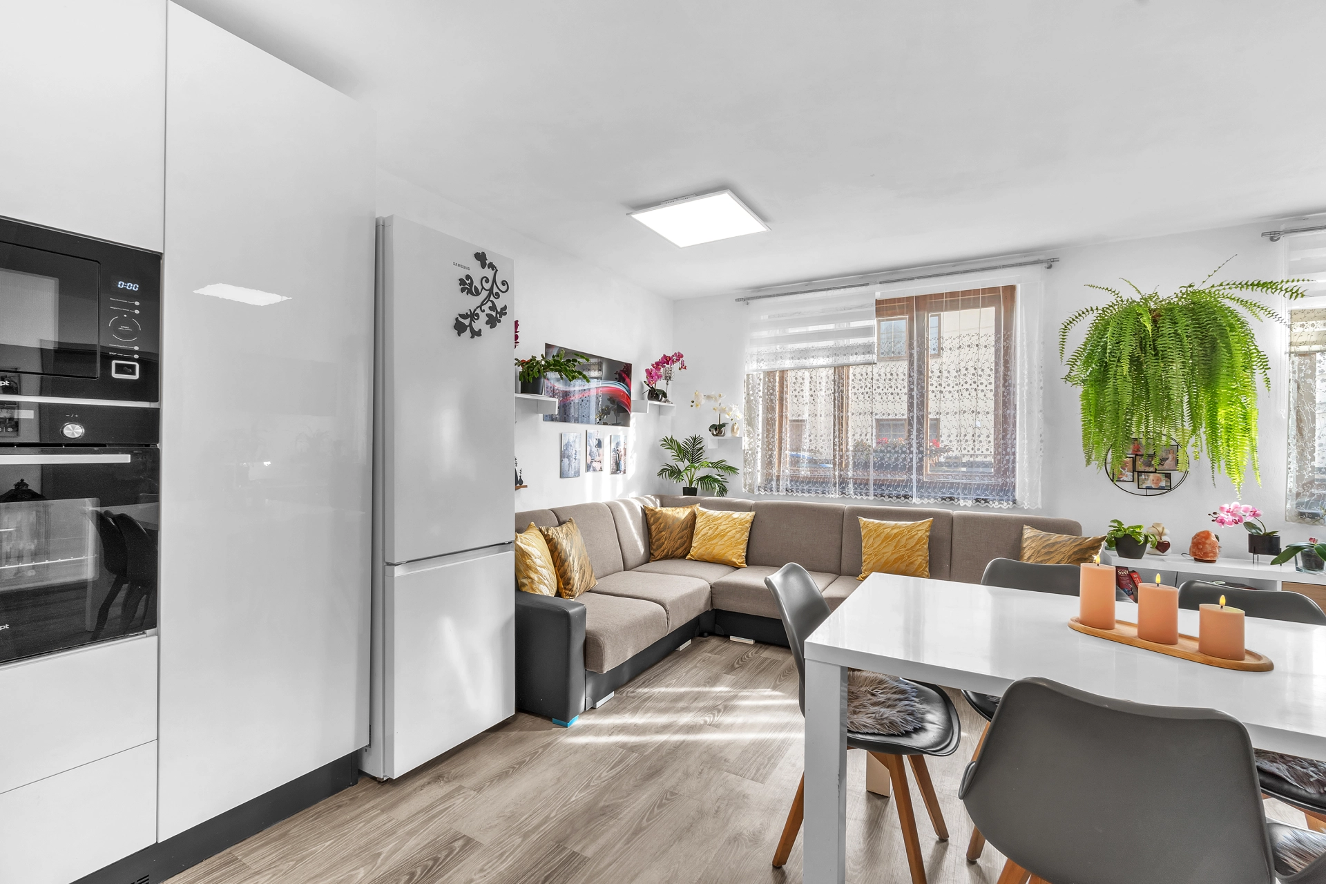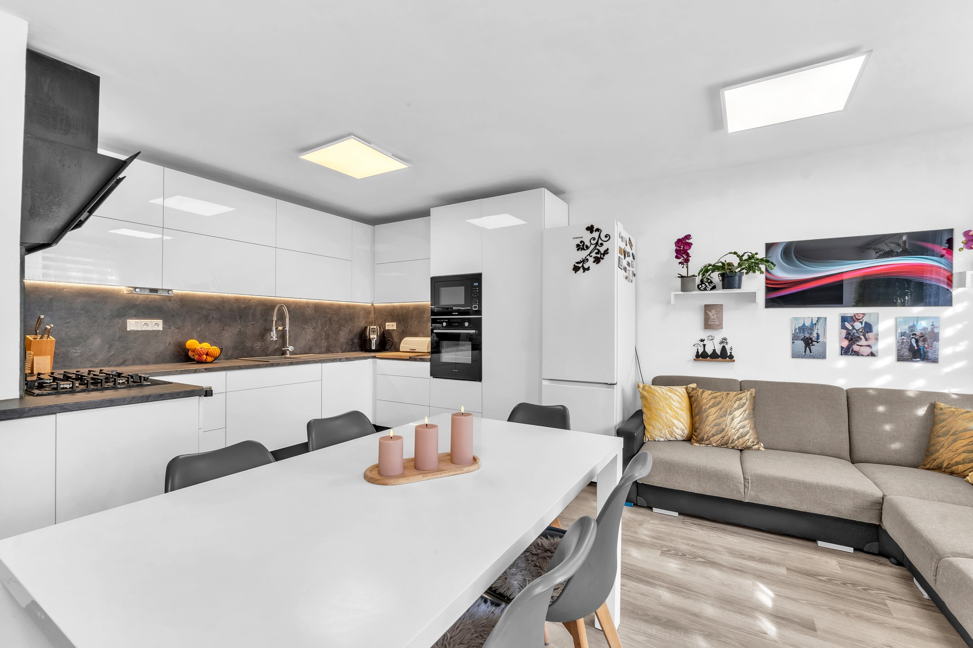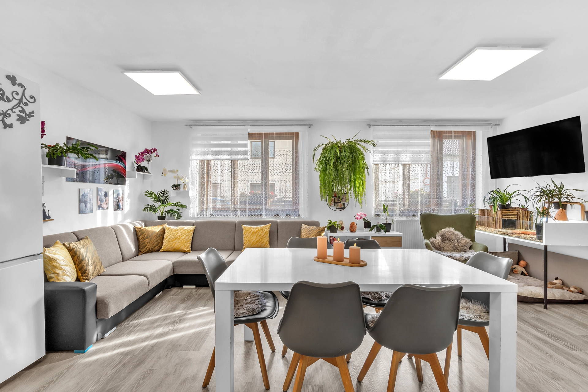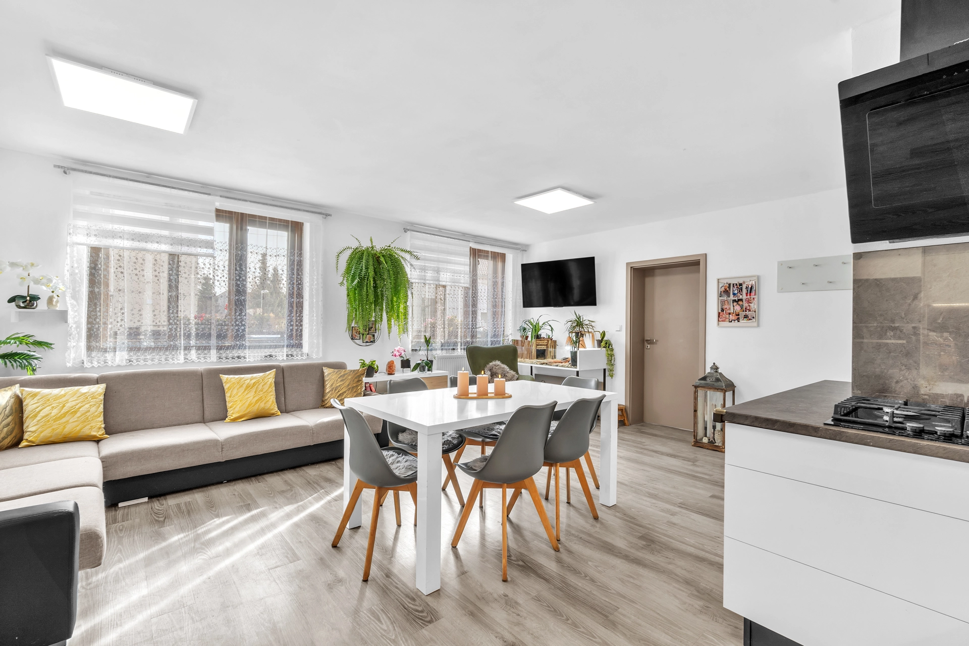 Dispozice: obývací pokoj s kuchyňským koutem, dvě ložnice, pracovna/dětský pokoj, koupelna, samostatné WC.