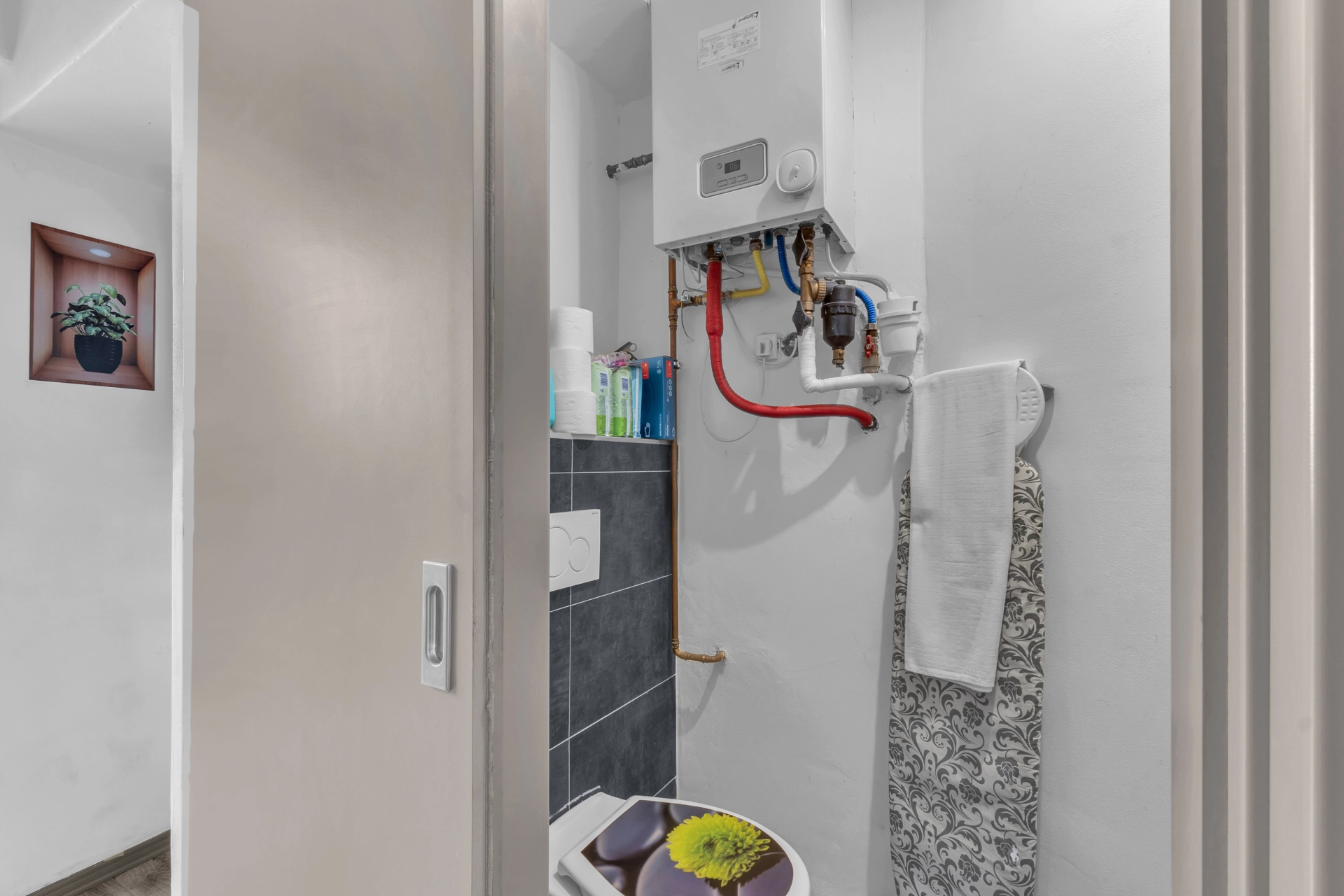 Topení plynovým kotlem, ohřev vody elektrickým bojlerem. Pitná voda z městského řadu, užitková voda ze studny na zalévání.