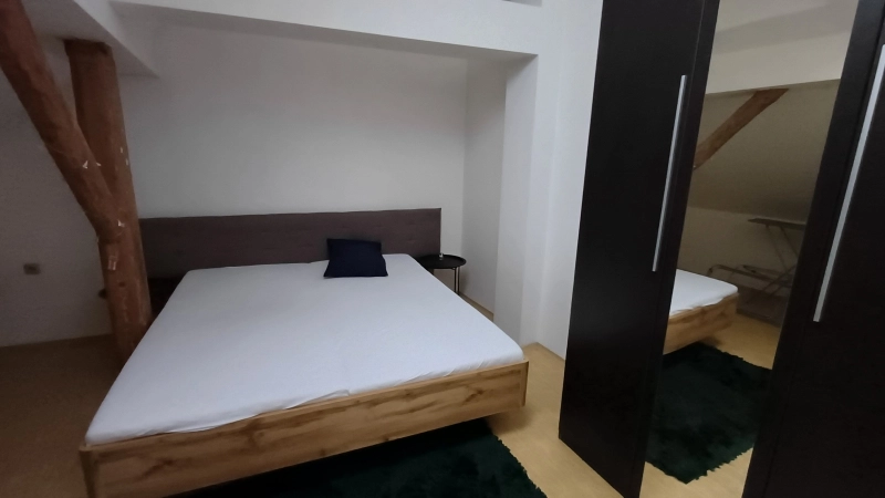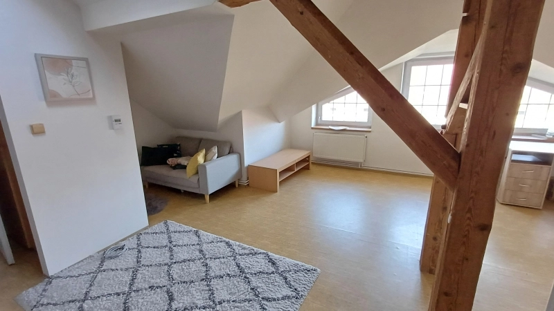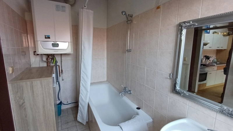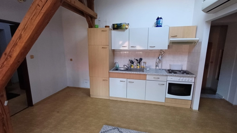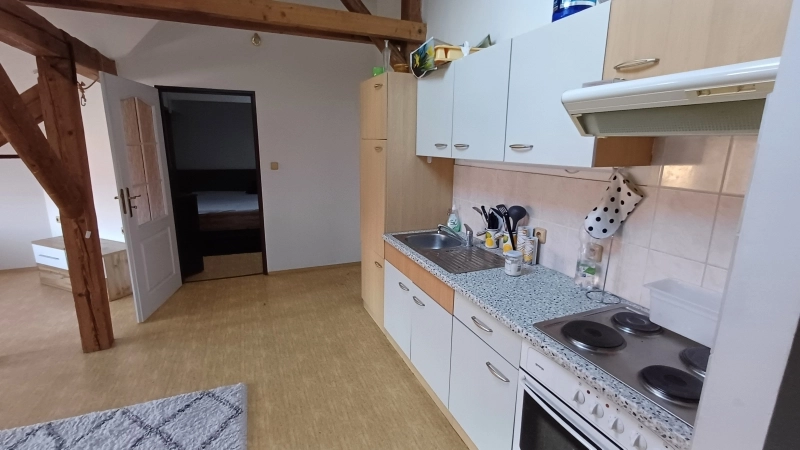 Dispozice: prostorná vstupní chodba, koupelna, samostatné WC, ložnice + hlavní obytná místnost s kuchyňským koutem. Byt je po rekonstrukci – zánovní kuchyňská linka se sporákem, nové WC, nová koupelna se sprchovým koutem, plynový kotel s bojlerem, mikrovlnná trouba, klimatizační jednotka, zanechané přiznané trámové prvky. Sítě: elektřina, ohřev vody a vytápění plynový kotel lokální, plyn.