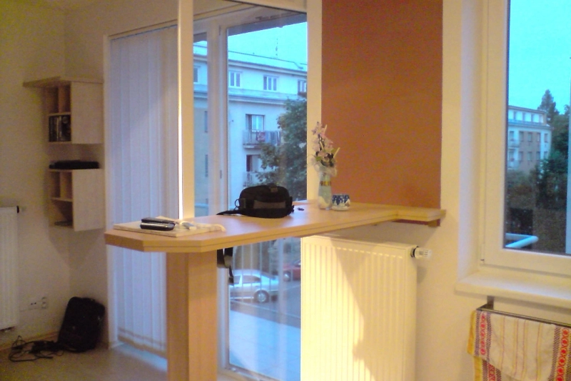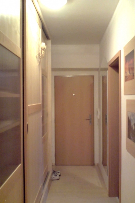 Dispozice bytu: vstupní chodba s velkou vestavěnou skříní, pokoj se vstupem na balkon, koupelna s vanou a WC, kuchyňský kout propojený s obývacím pokojem se vstupem na balkon. V bytě jsou ve všech místnostech plovoucí podlahy, v koupelně dlažba. Byt se nabízí nevybaven. K dispozici je elektřina 230V, topení a ohřev vody dálkově.