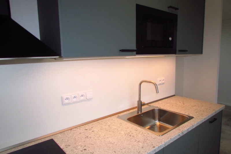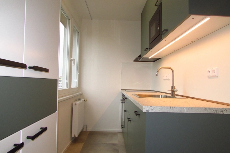 Byt je po kompletní rekonstrukci - nové, zvětšené jádro, rozvody elektro, internetu a STA vč. zásuvek a vypínačů, LED osvětlení na dálkové ovládání, vinylové podlahy, vchodové i interiérové dveře a nová kuchyňská linka se spotřebiči (el. varná deska + digestoř, myčka, el.trouba, mikrovlnná trouba). Byt se nabízí bez vybavení.