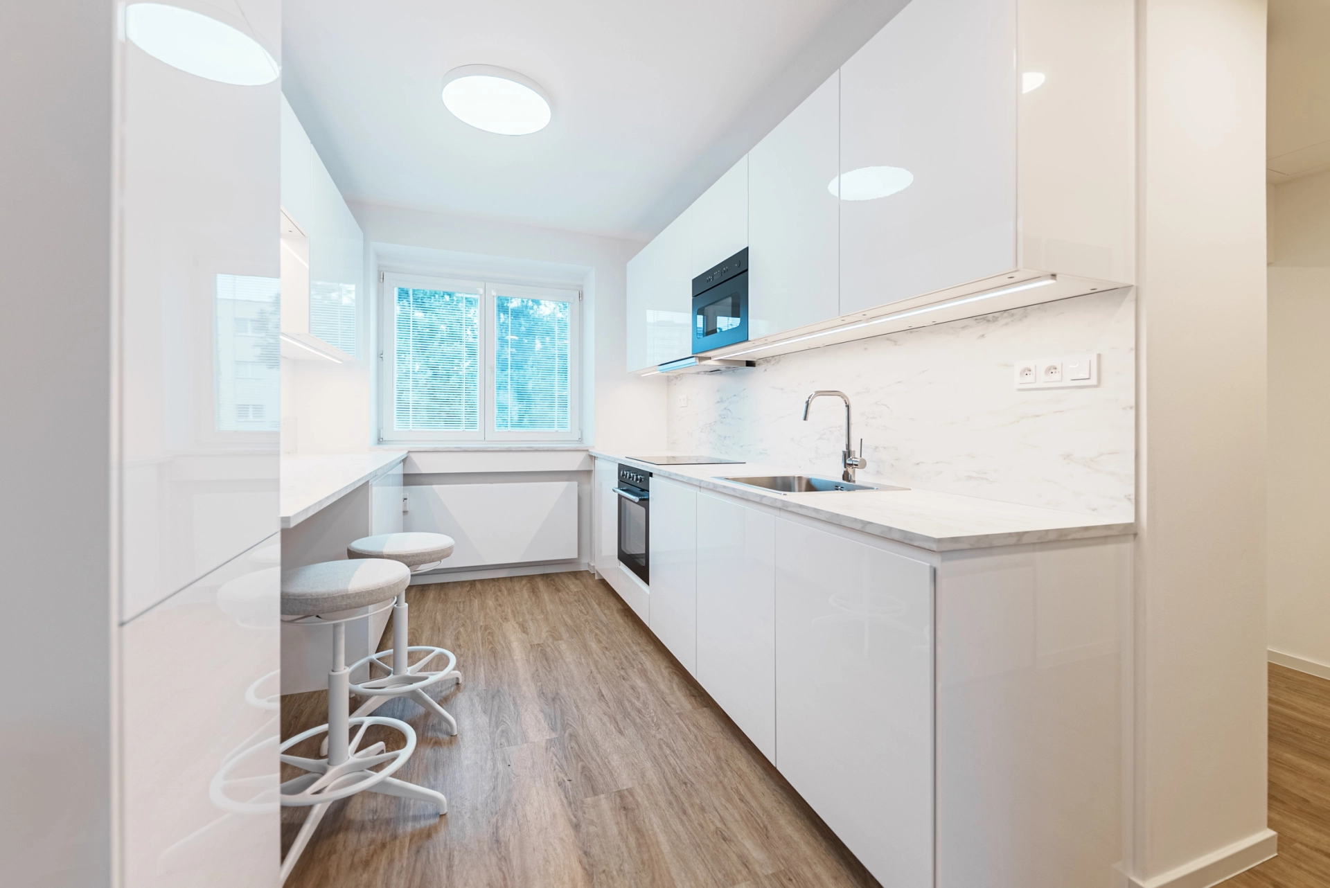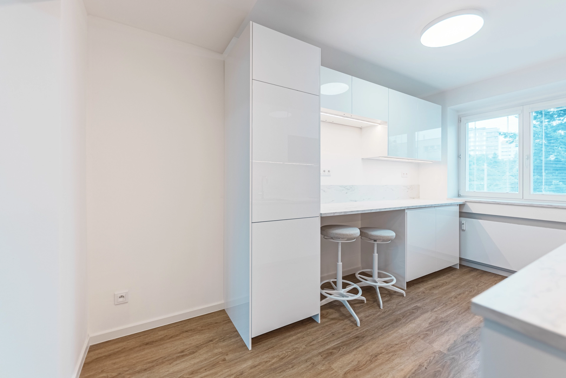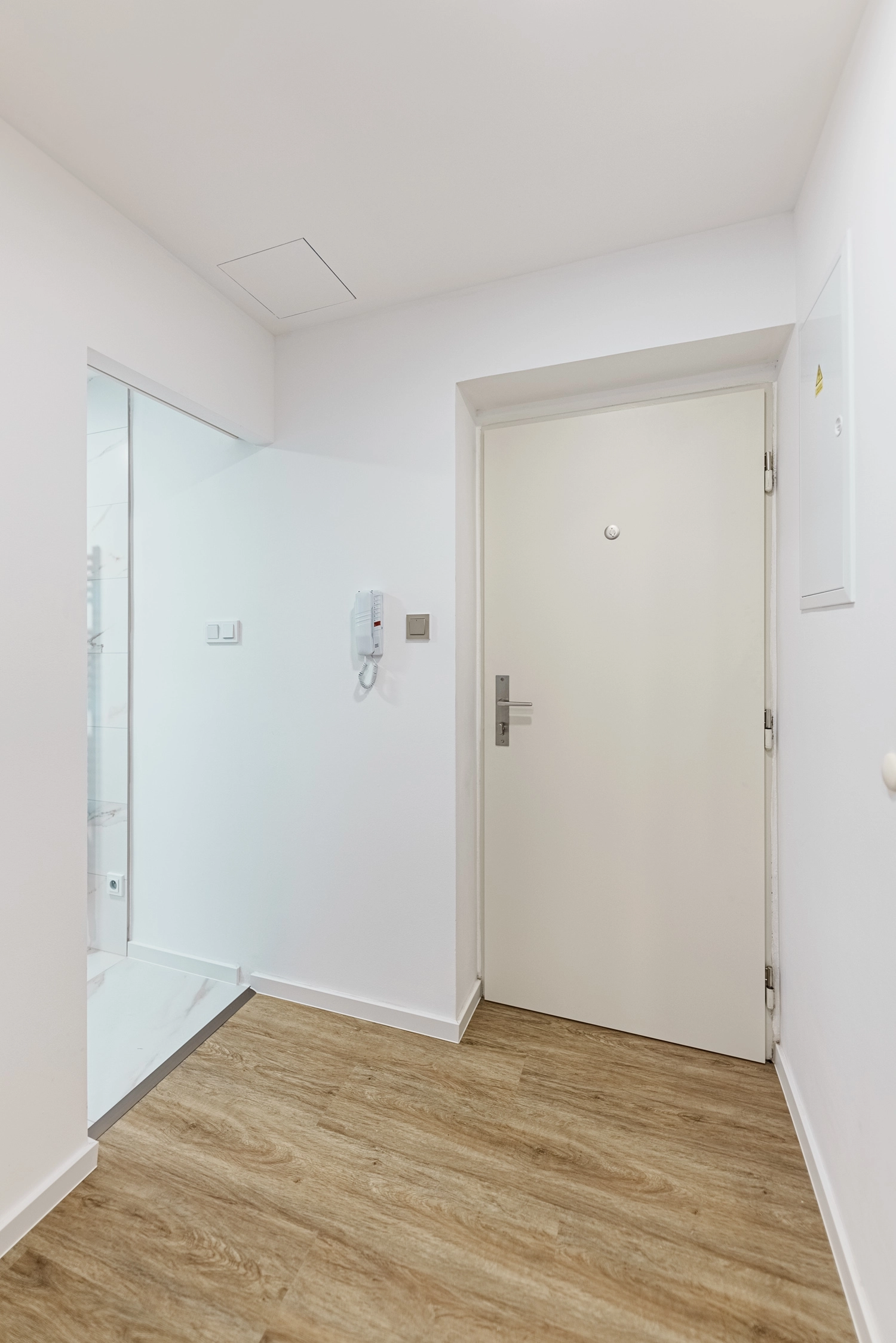 Byt je po kompletní rekonstrukci - nové rozvody elektro, internetu a STA vč. zásuvek a vypínačů, LED osvětlení na dálkové ovládání, vinylové podlahy, vchodové i interiérové dveře a nová kuchyňská linka se spotřebiči (el. indukční deska + digestoř, myčka, el.trouba, mikrovlnná trouba) + dvě barové židle, kompletně nová koupelna včetně sanity. Byt se nabízí bez nábytku.
